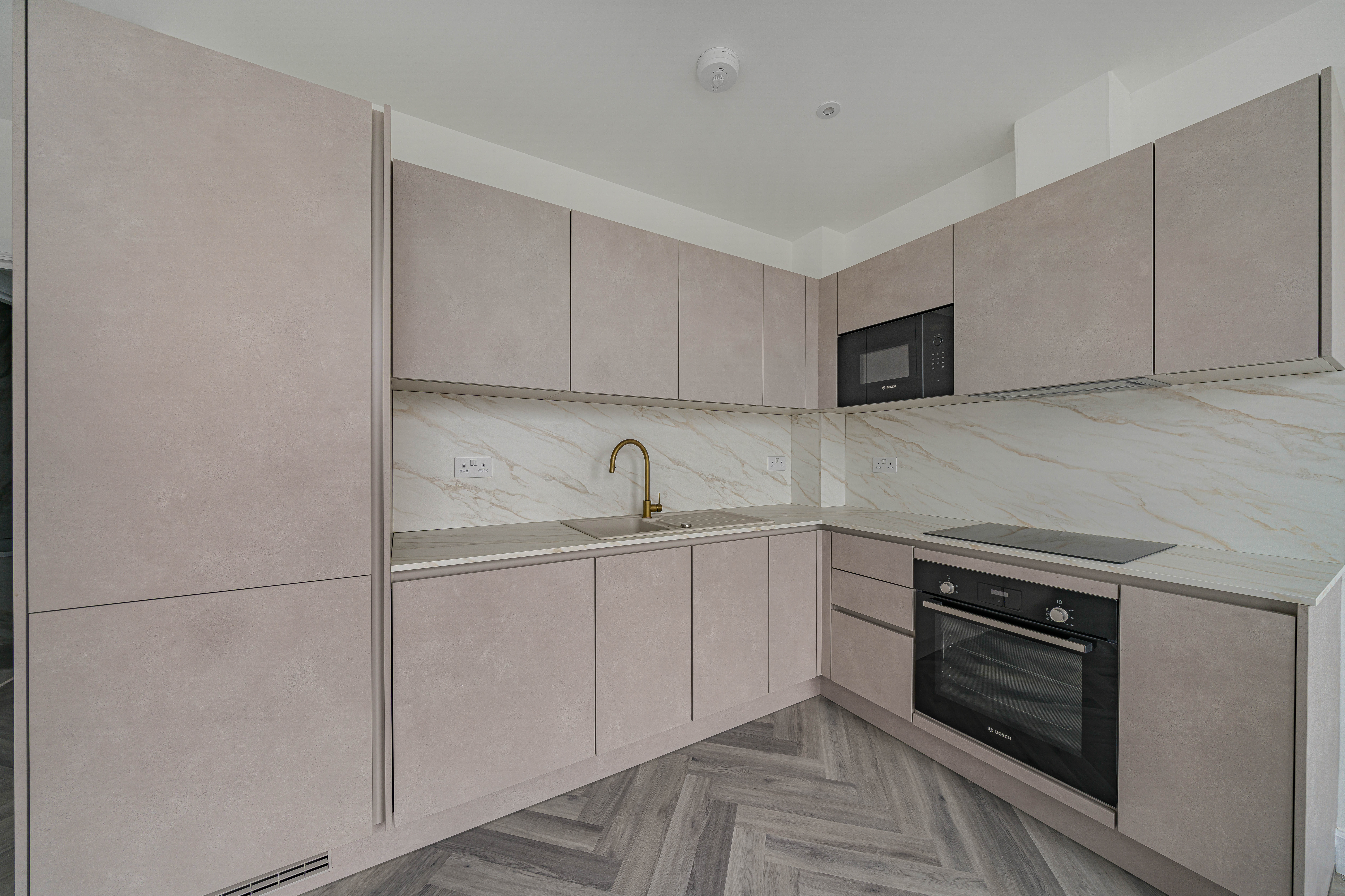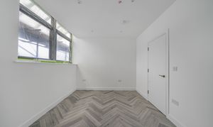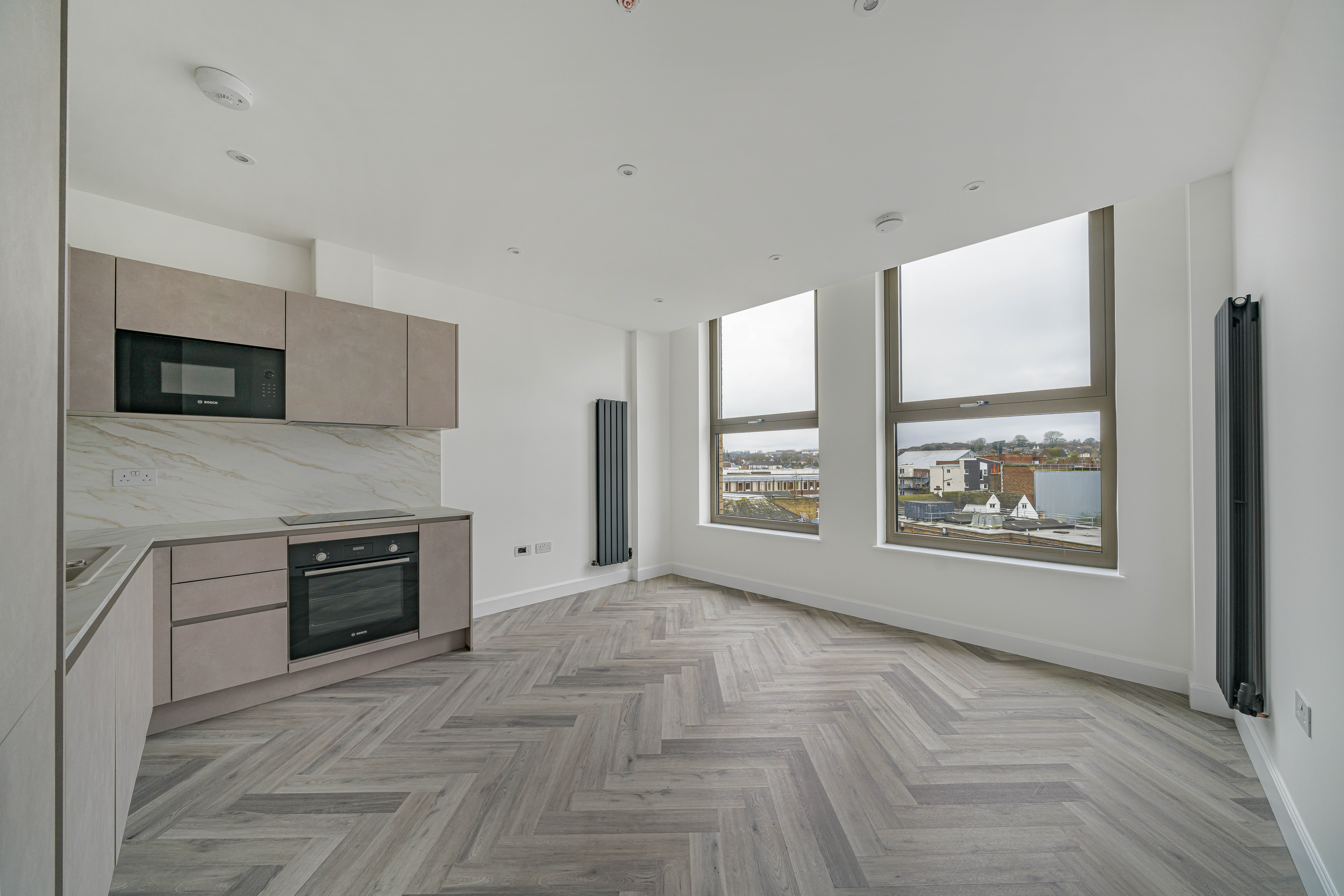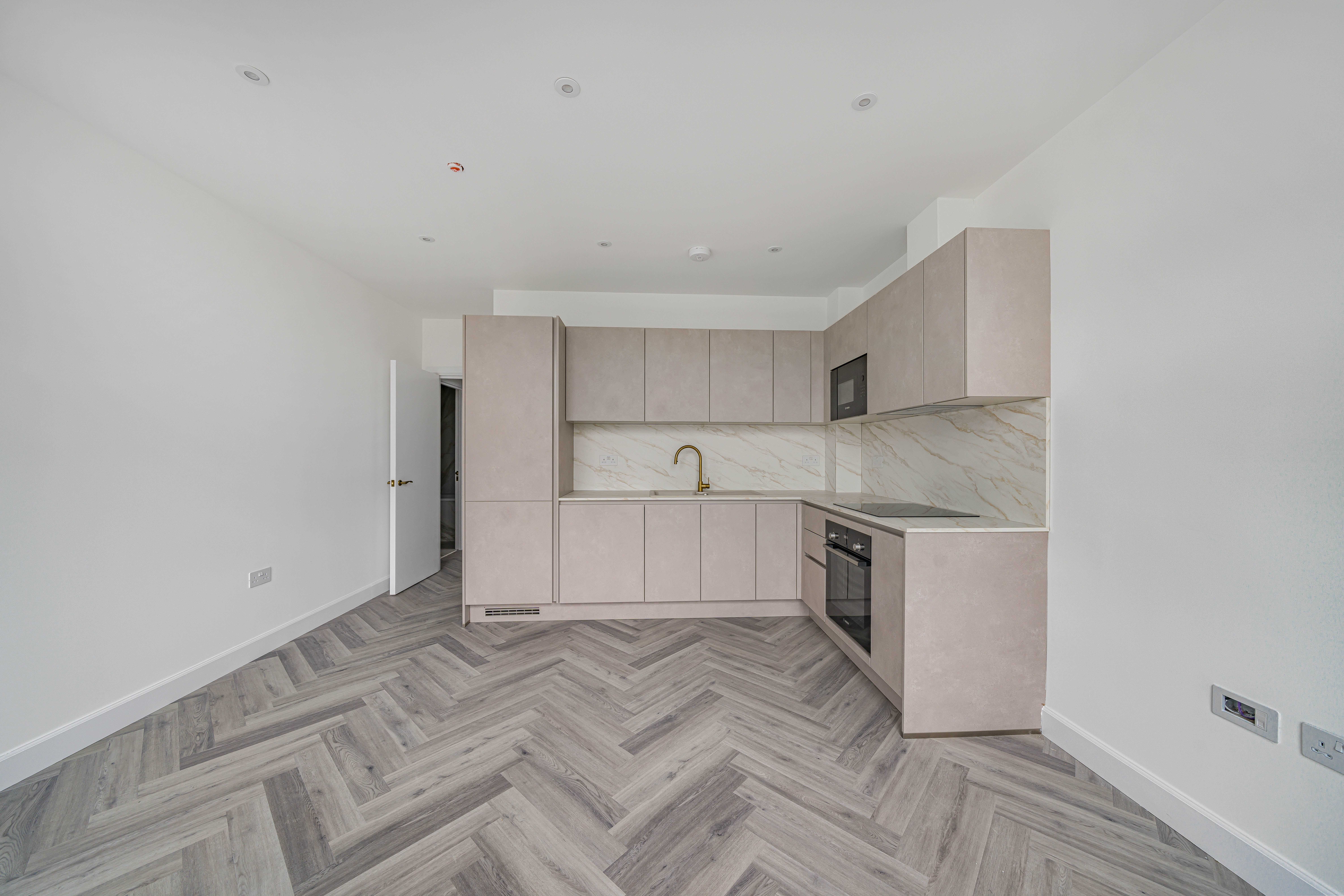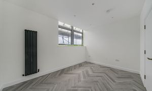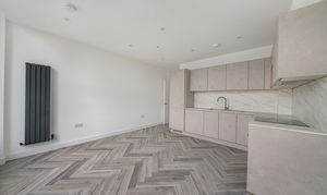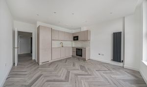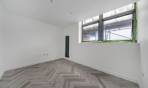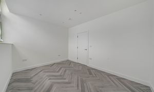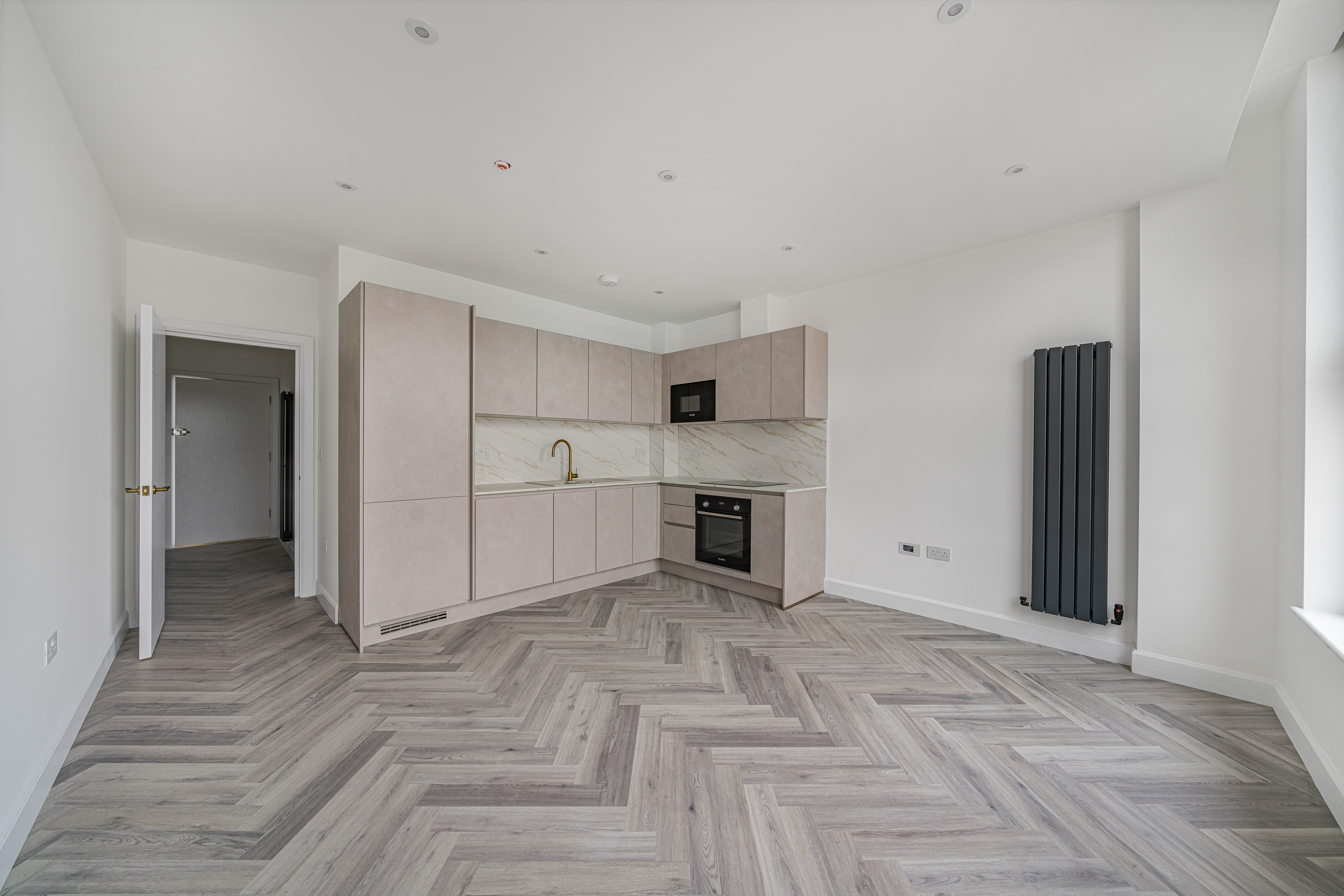 Designed with a focus on contemporary elegance and functionality, this exceptional flat features an open-plan layout that provides a versatile and spacious living area, ideal for both relaxing and entertaining. The sleek, modern kitchen is equipped with high-quality integrated appliances, offering a seamless and stylish cooking environment that will appeal to both budding chefs and those who appreciate modern design. Throughout the apartment, elegant herringbone-style flooring adds a timeless sense of character and sophistication, beautifully complemented by the abundance of natural light that floods in through large windows, creating a bright, airy, and inviting atmosphere. The living space is further enhanced by contemporary vertical radiators, which provide efficient heating while also acting as a chic design feature. The modern bathroom is finished to a high standard, featuring gold fixtures that add a luxurious touch to the contemporary décor.