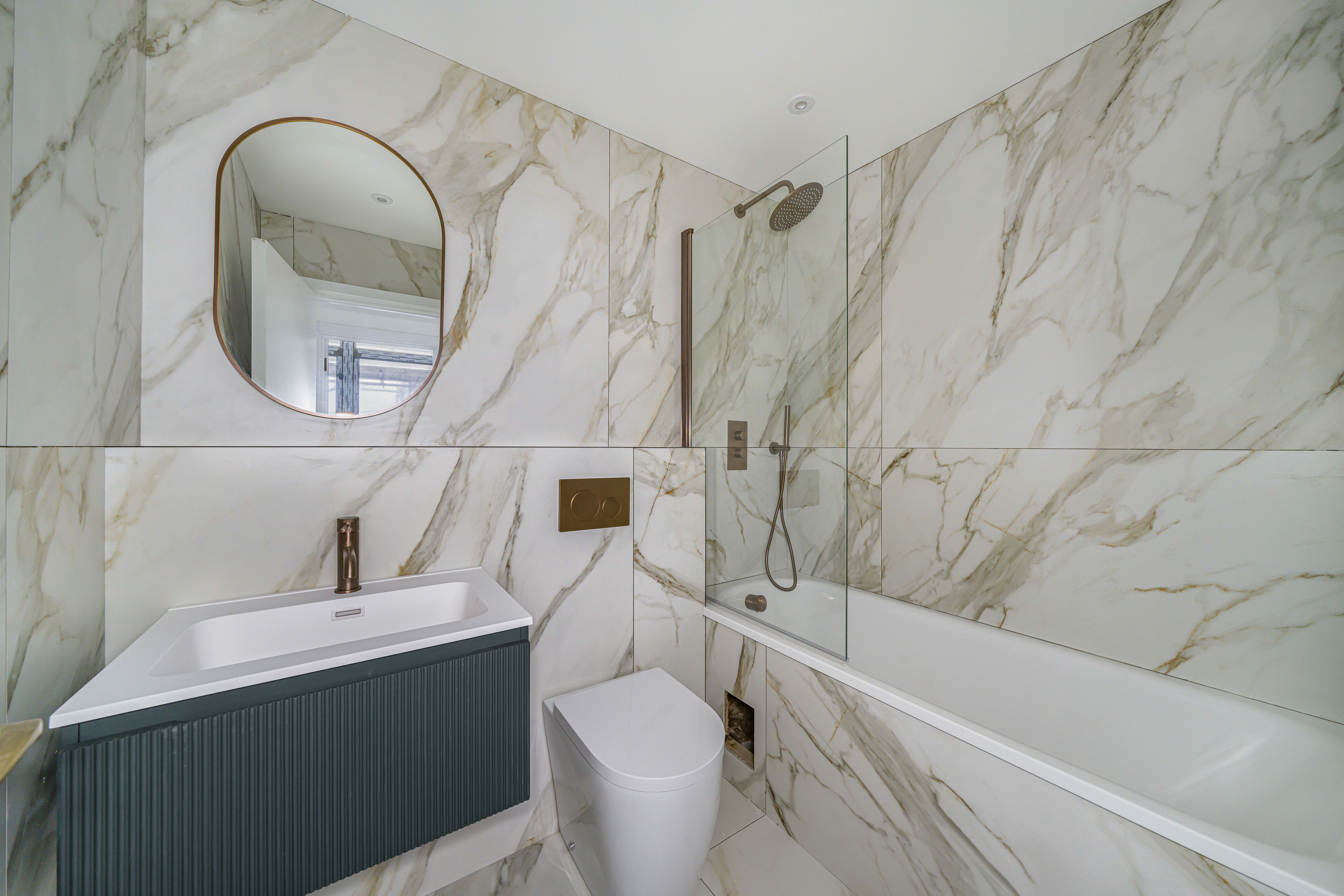 - Modern bathroom with gold fixtures – sleek, contemporary design with a luxurious finishing touch