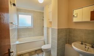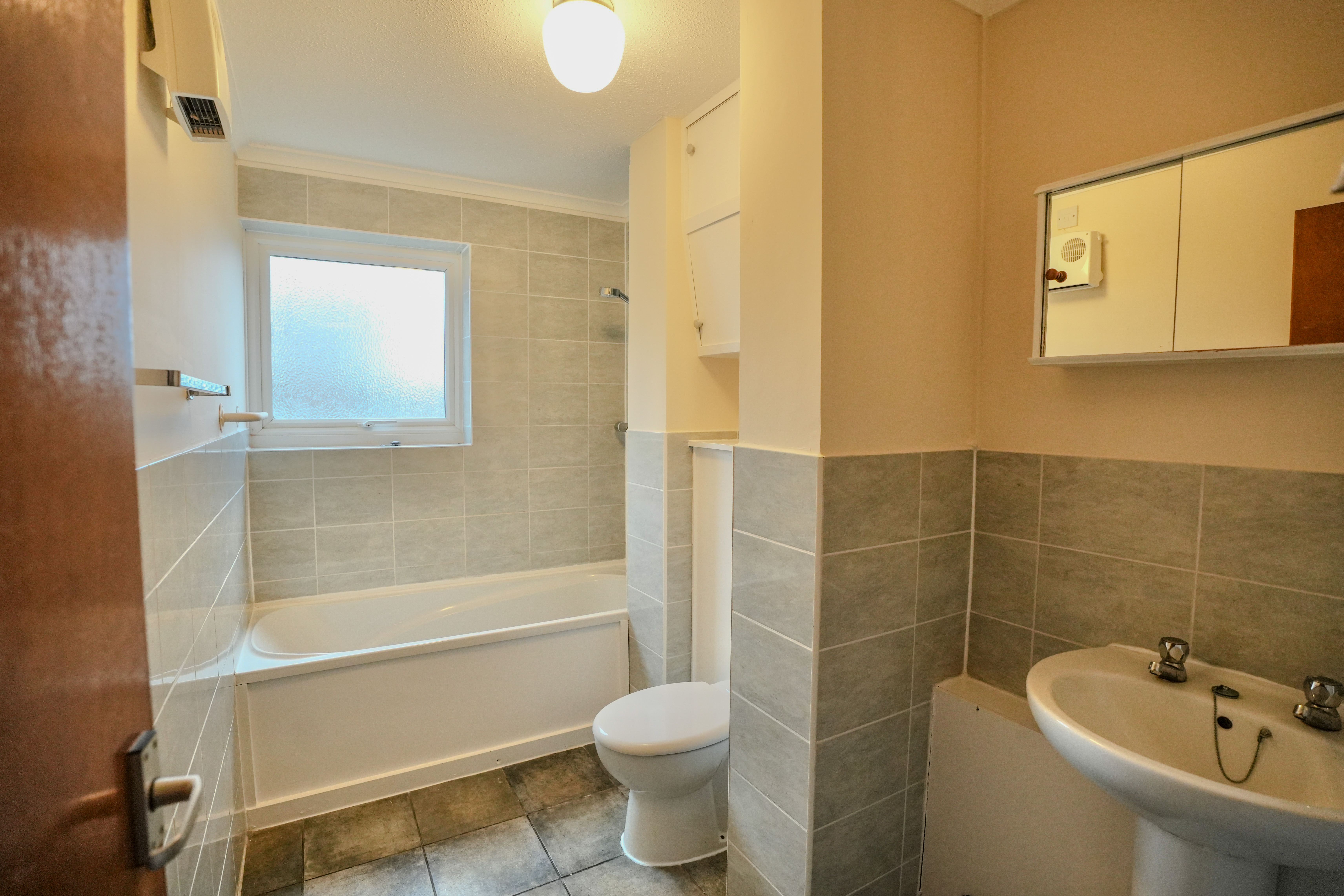 uPVC obscure double glazed window to the side aspect, part tiled walls, tiled flooring, built-in storage cabinets, wall mounted electric fan heater, pedestal wash hand basin, concealed cistern WC and panel-sided bath with shower mixer bar over.