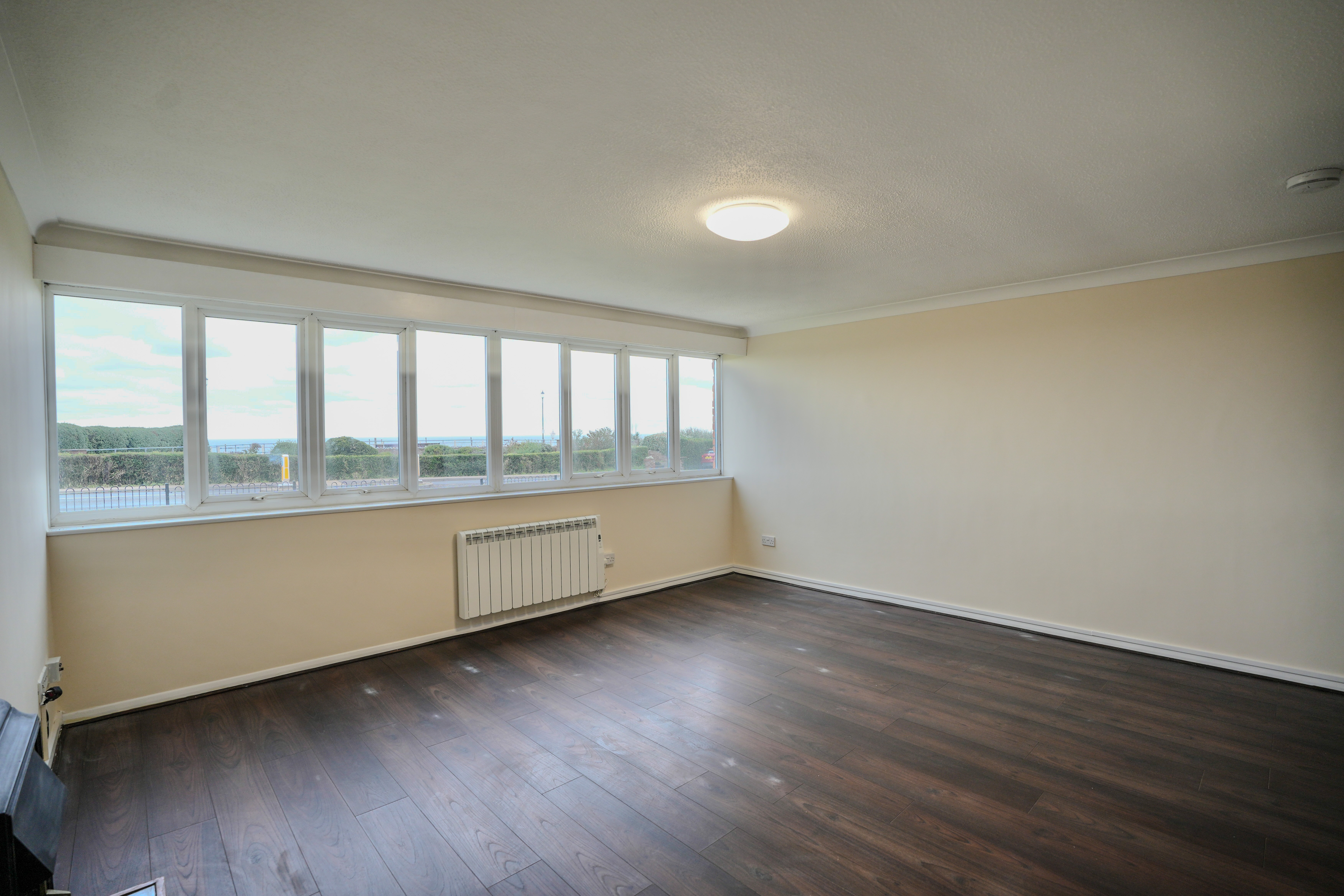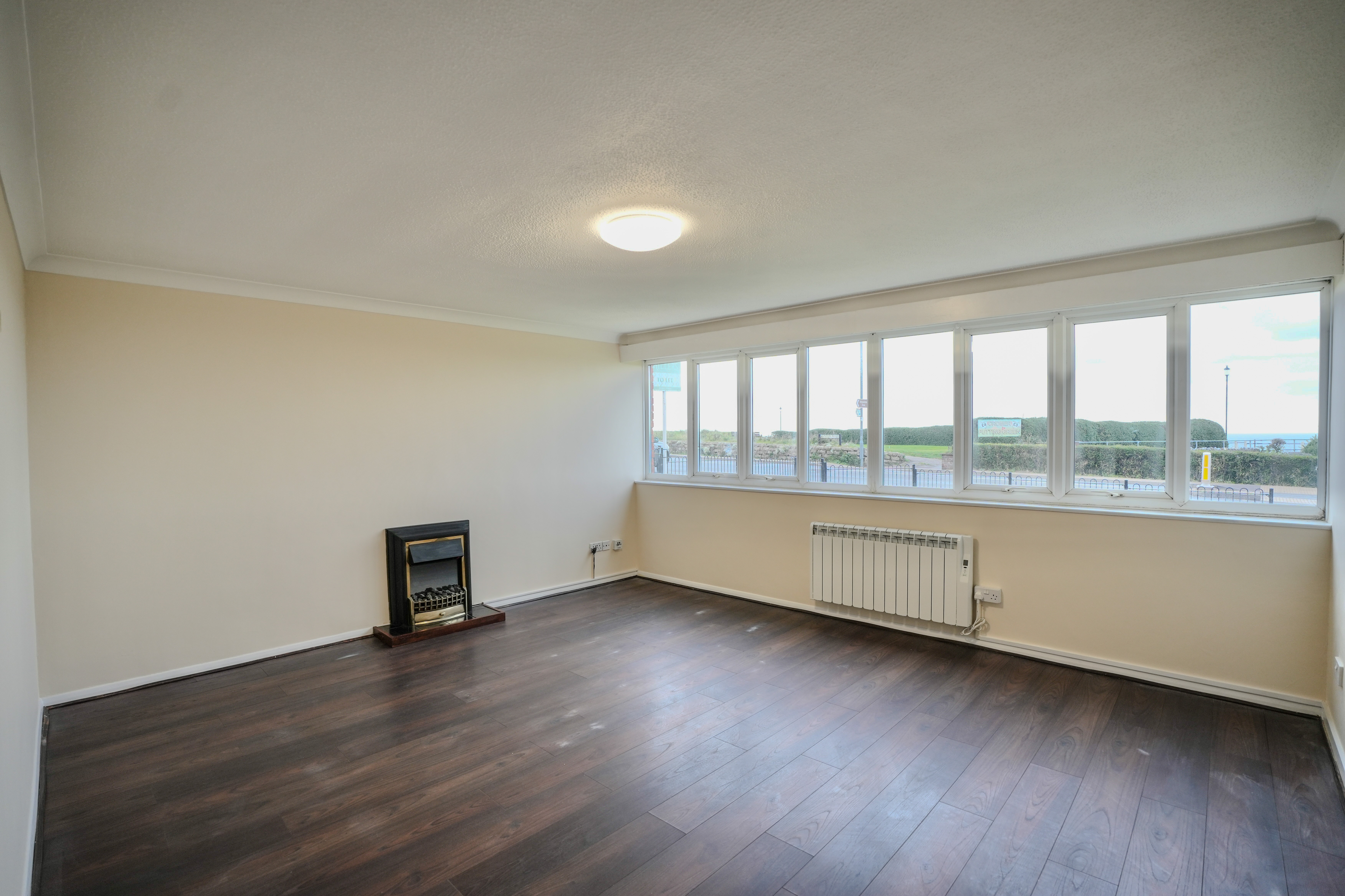 uPVC double glazed windows to the front aspect providing views towards the sea, wood effect flooring, wall mounted modern electric heater and feature electric fire.