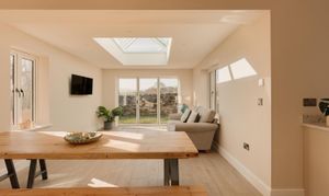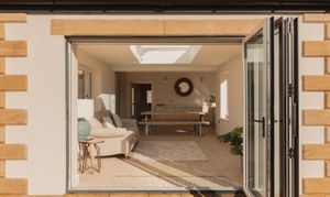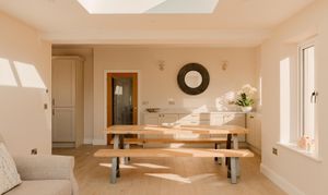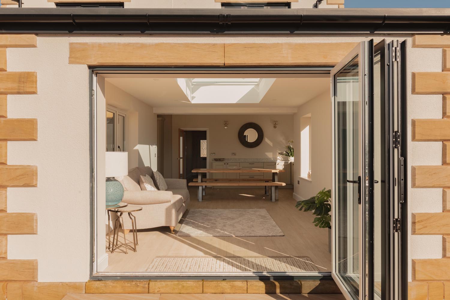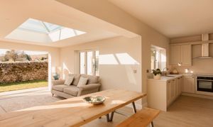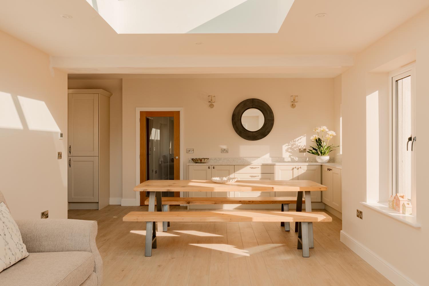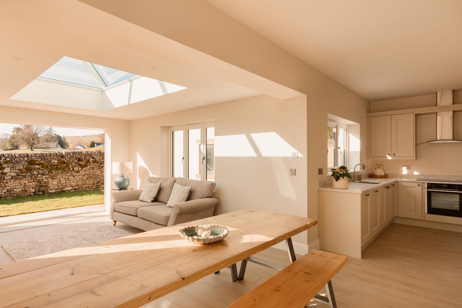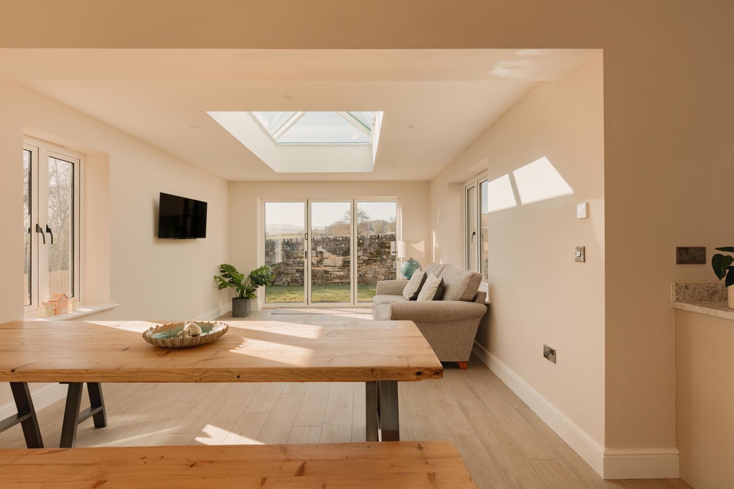 Beyond the dining area, the space opens into a striking sun room where a glazed lantern roof draws daylight deep into the interior. Large windows and bi fold doors frame views across the garden and the open landscape beyond, bringing the surrounding countryside visually into the home and creating a relaxed, light filled sitting area that naturally becomes a focal point of the house.