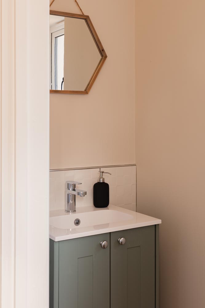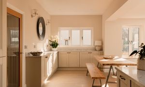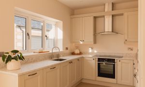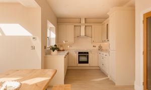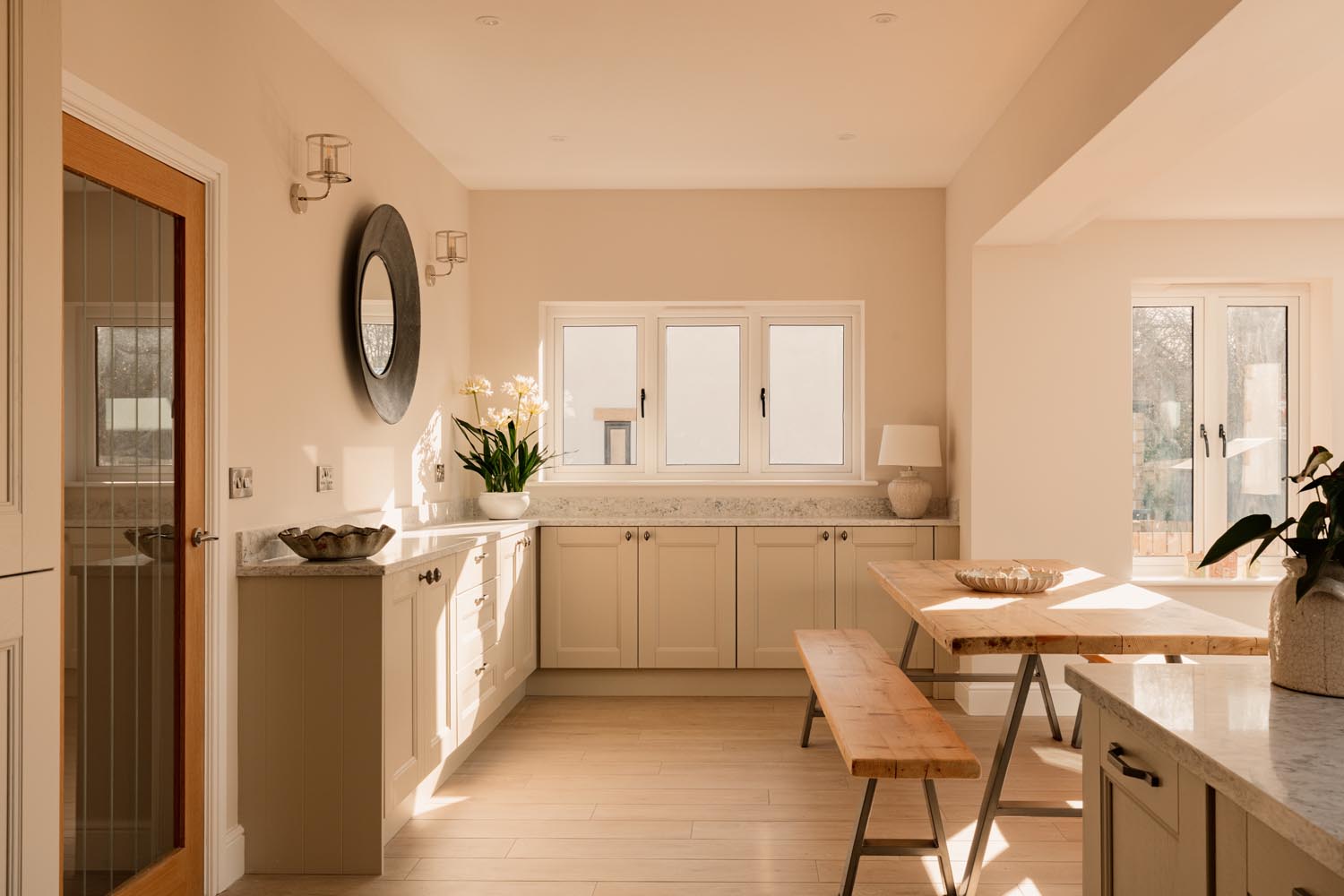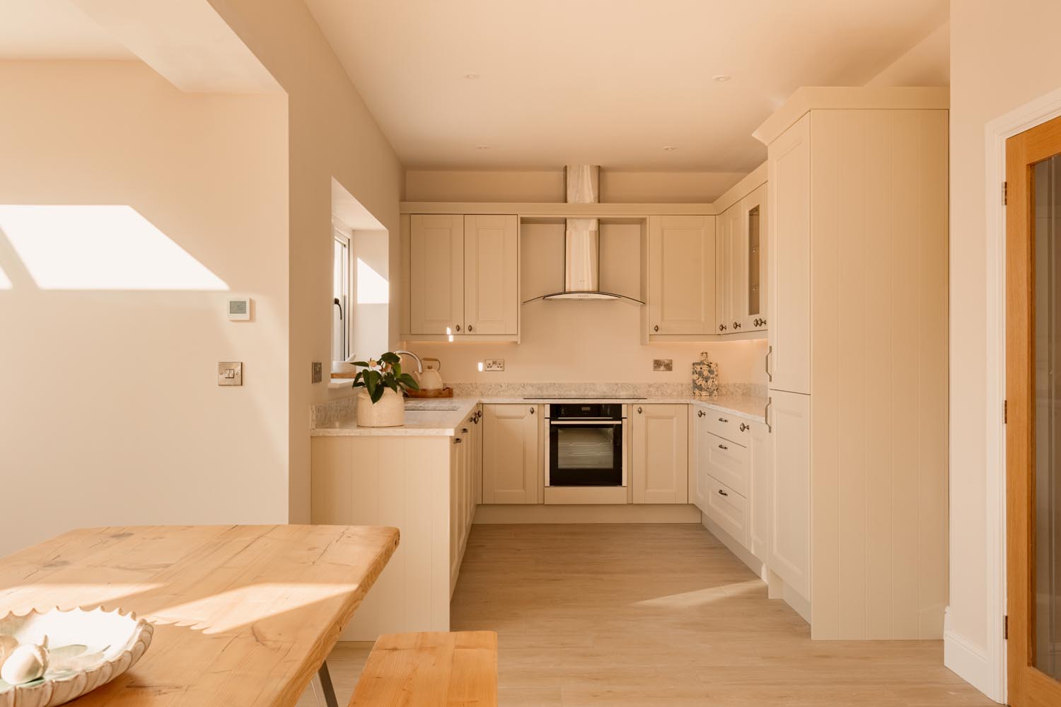 To the rear of the house, the kitchen and dining area form the social centre of the home. Shaker style cabinetry runs along two sides of the kitchen, offering generous storage and preparation space, alongside integrated appliances including a Neff oven with slide and hide door and a built in fridge freezer. The layout flows naturally into the dining area, where ample space is provided for a large table, creating a setting well suited to both everyday family life and relaxed entertaining.