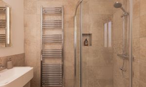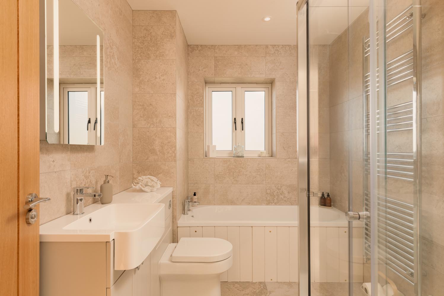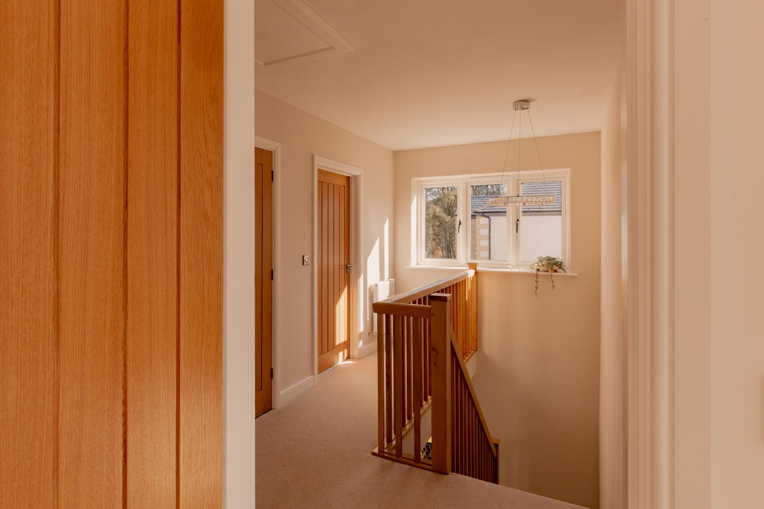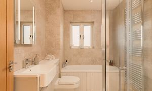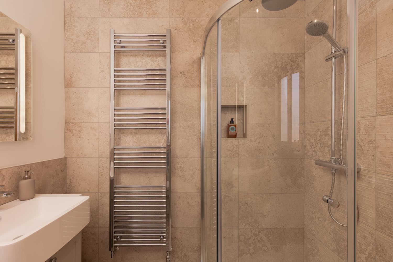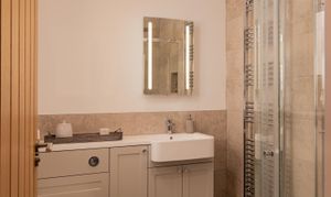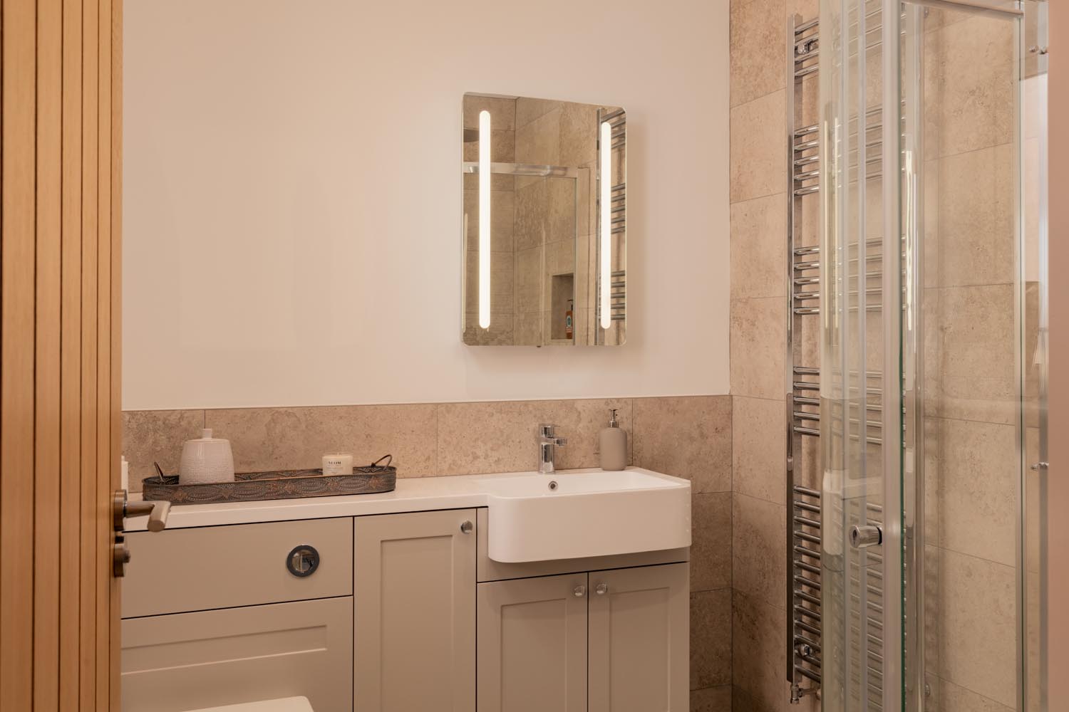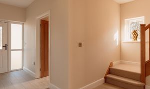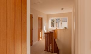 Upstairs, three bedrooms are arranged around the central landing, each enjoying views across the surrounding countryside. The principal bedroom benefits from its own en suite shower room. Two further bedrooms are served by a well appointed family bathroom with a bath and separate walk in shower enclosure, finished with full height tiling, a vanity basin unit with storage and a heated towel rail.