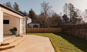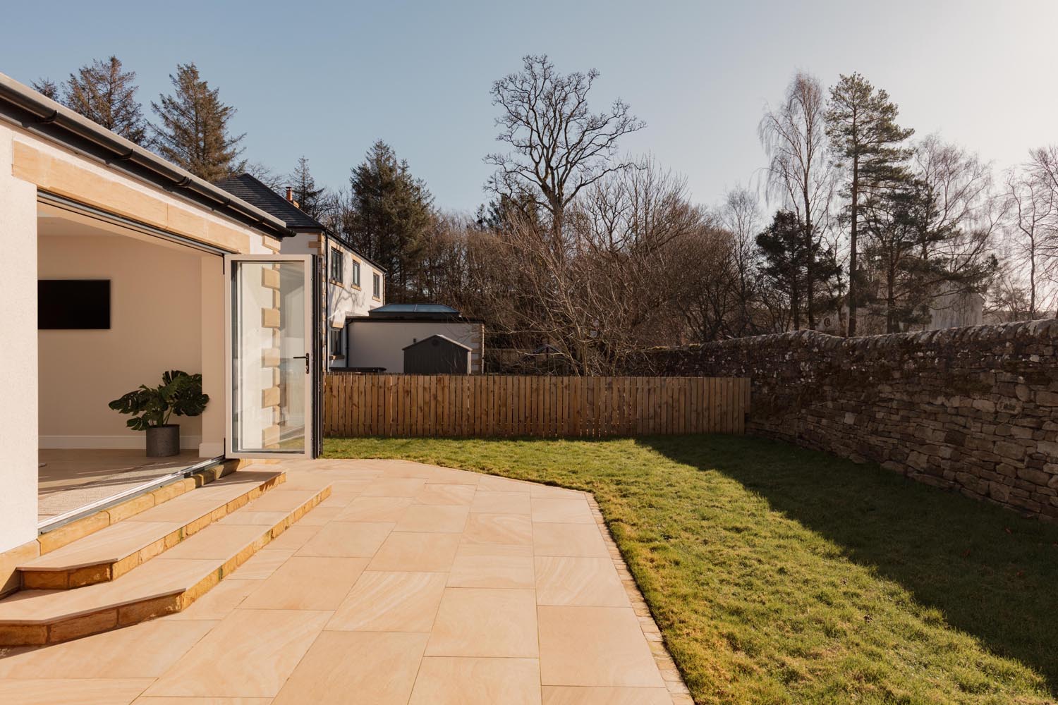 The property sits comfortably within its plot, approached via a pebble driveway that provides ample parking and leads to a detached double garage with electric door and power sockets. The gardens are mainly laid to lawn and enclosed with fencing and traditional stone walling, creating a defined yet open setting with views across the surrounding countryside. Broad paved patio areas extend directly from the house, providing ideal spaces for outdoor seating and dining, while a paved ramp offers practical access around the property.