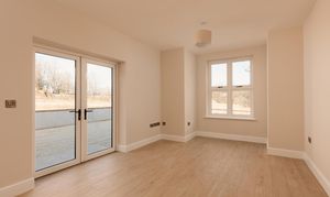 A central entrance hall provides a calm introduction to the house, finished with porcelain flooring that continues throughout the ground floor and is complemented by underfloor heating. From here, the principal reception room sits to one side, a well proportioned lounge with wide French doors opening directly onto the garden. The room enjoys a pleasant outlook and an easy connection to outside, creating a natural extension of the living space during the warmer months.