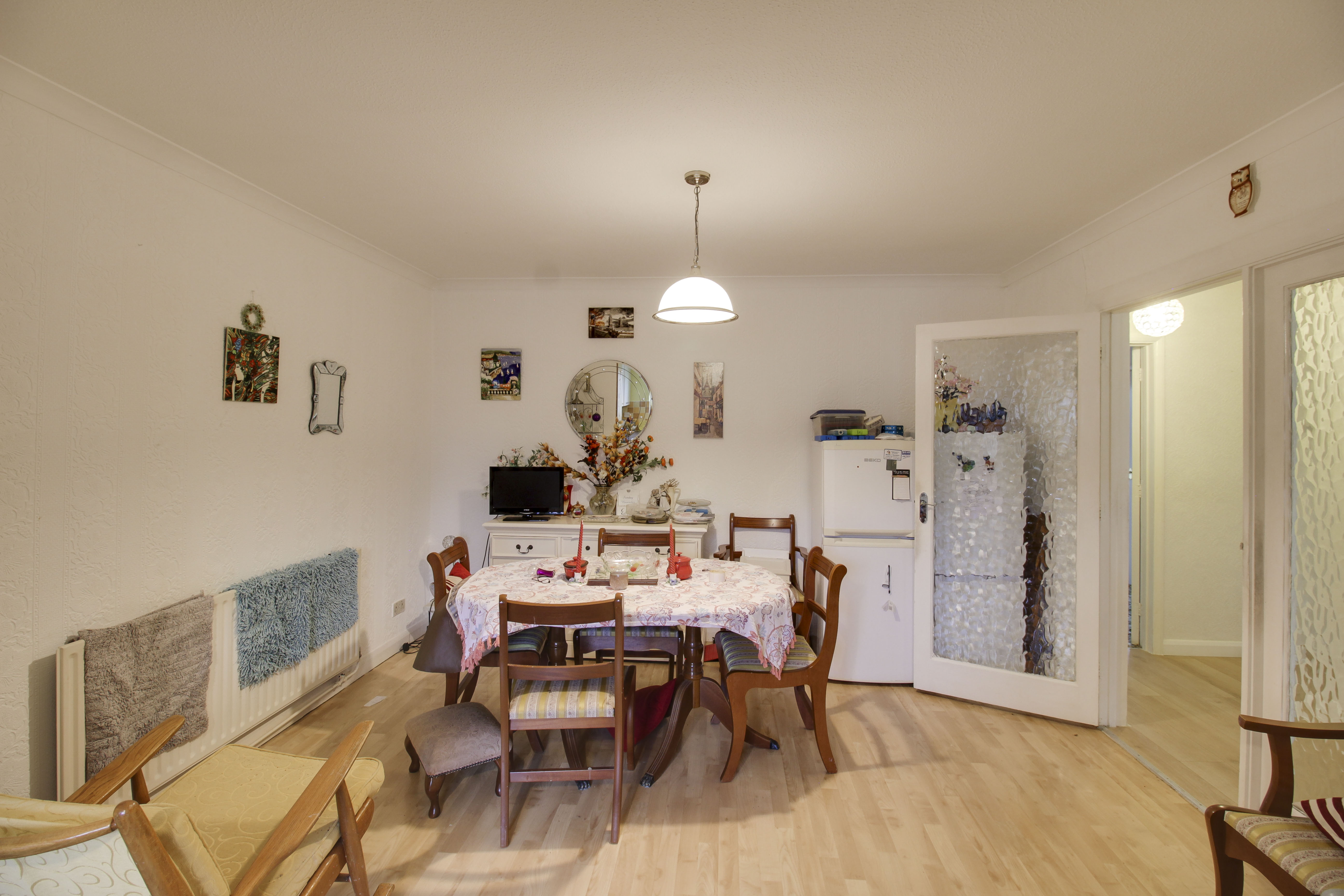 Wood flooring. Radiator. Open plan through to kitchen.