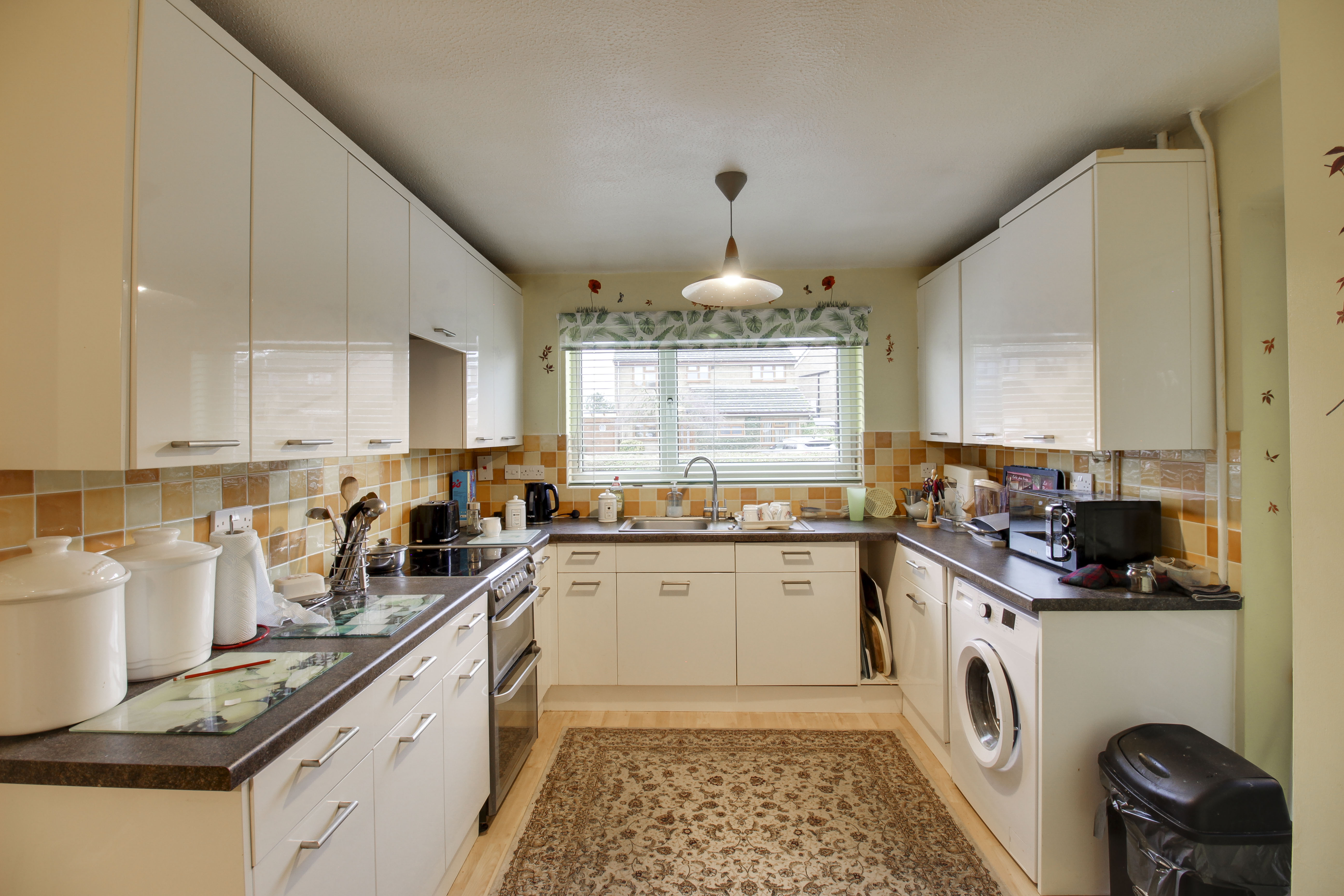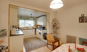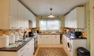 Fitted kitchen comprising work surfaces with drawers and cupboards under. Wall mounted cupboards. Single bowl sink with mixer tap and tiled splashbacks. Electric cooker point with extractor fan over. Plumbing for washing machine. UPVC door to side. UPVC window to front. Cupboard housing gas boiler.