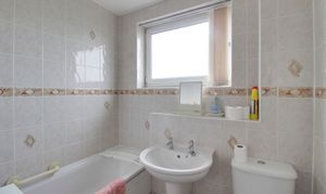 Three piece suite comprising low level WC, pedestal wash hand basin and panelled bath with shower over and tiled splash backs. Heated towel rail. UPVC window to front.
