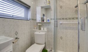 Three piece suite comprising low level WC, wash hand basin and corner shower unit with glass screen and tiled splash backs. Heated towel rail. UPVC window to front.