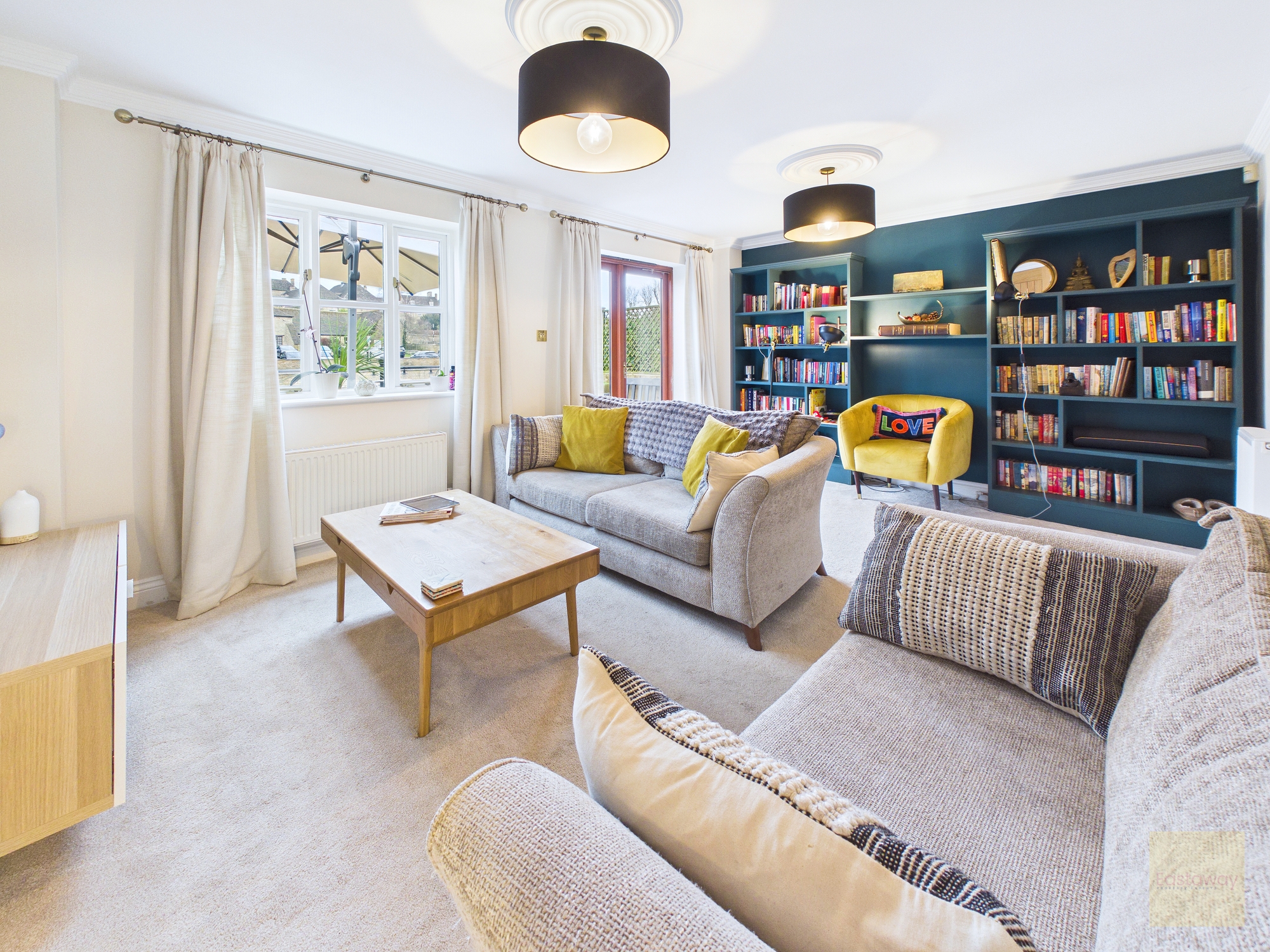 The living room is a fantastic space and full of personality. A bespoke handmade shelving unit spans the wall, with a reading chair tucked beneath it that has become a favourite spot. It is bright and welcoming, and when the patio doors are open, the river quite literally becomes part of the room. The decked terrace flows straight from the living space, making summer evenings by the water feel effortless.