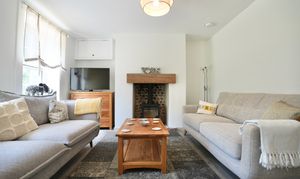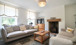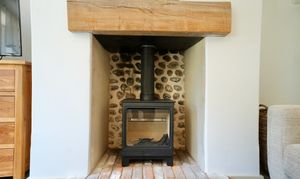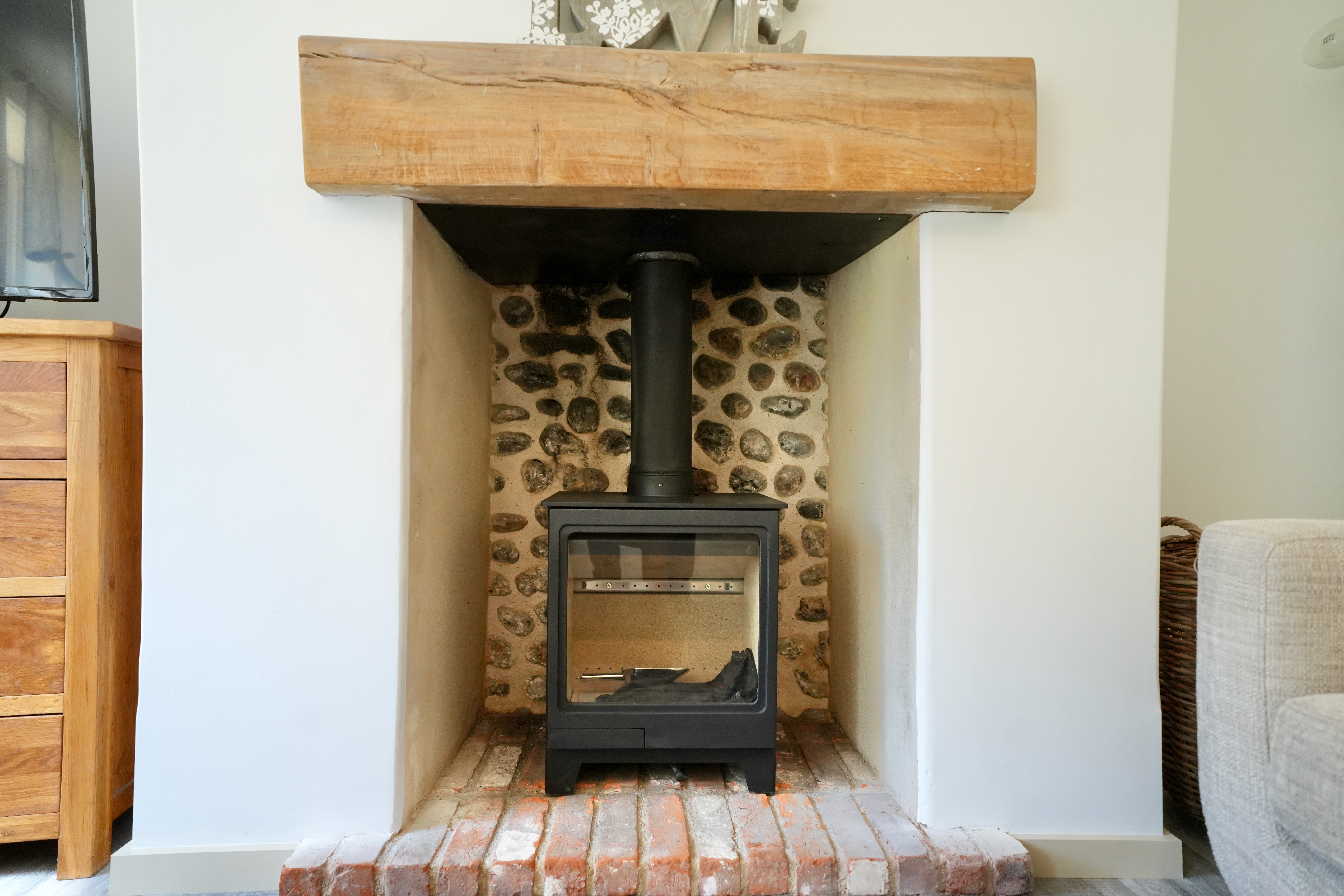 Two uPVC double glazed windows to the front aspect, wood effect flooring, wood burning stove inset within chimney with timber mantel and brick built hearth.