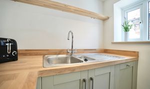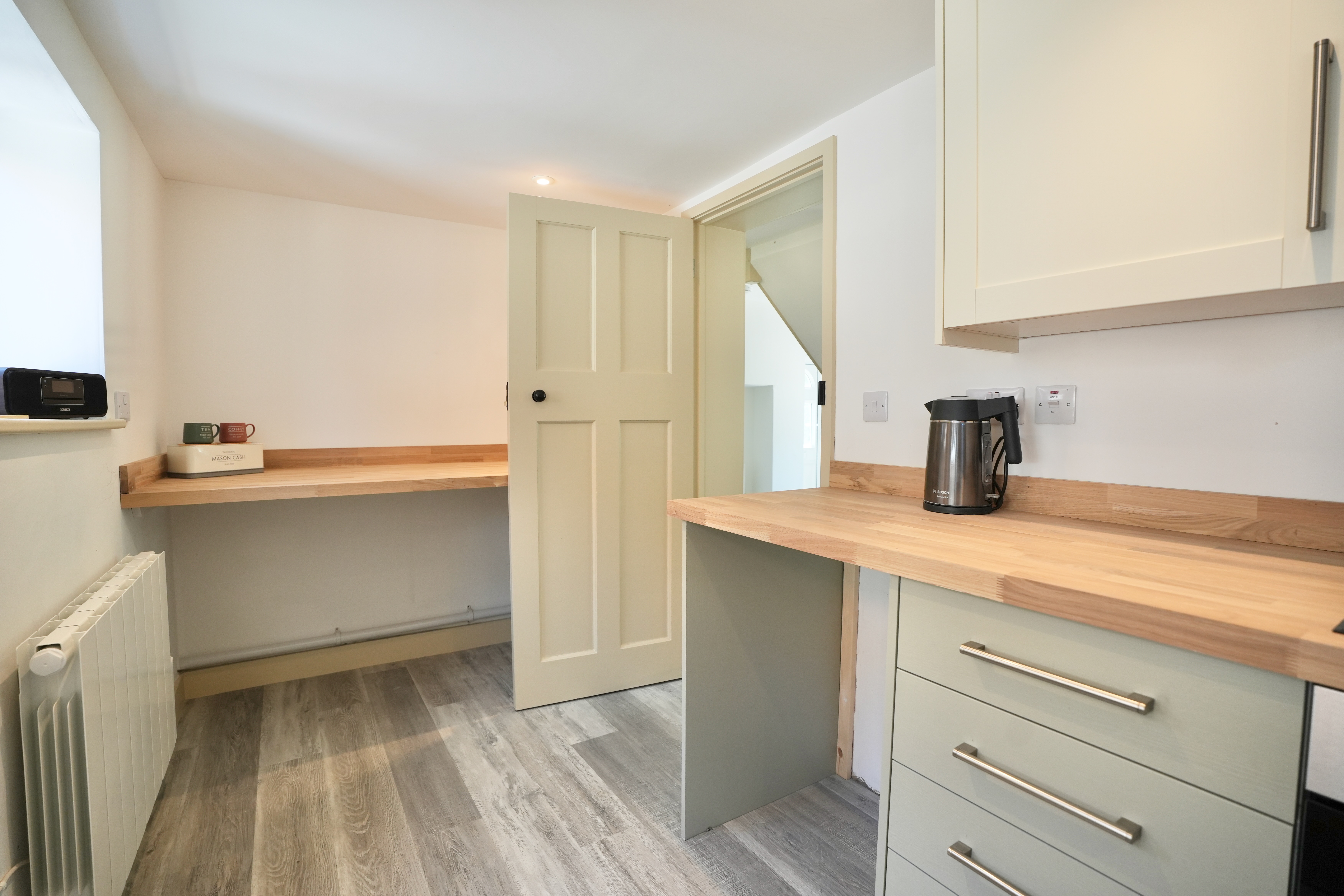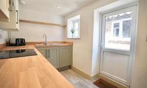 Two uPVC double glazed windows to the rear aspect, uPVC part double glazed entrance door, a range of newly fitted base and wall mounted units with wooden work surfaces over and matching upstands, inset one and a half bowl stainless steel sink with side drainer, built-in electric oven, inset four ring electric hob with splash back and extractor hood over, integrated slimline dishwasher, space for undercounter fridge, space and plumbing for washing machine, breakfast bar area, wall mounted modern electric heater, inset ceiling downlighters and wood effect flooring.