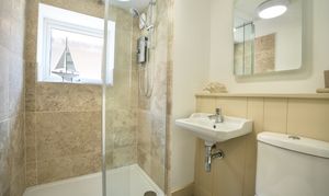 uPVC obscure double glazed window to the rear aspect, tile effect flooring, part tiled walls, extractor fan, wall mounted heated towel rail, walk-in shower enclosure, wall mounted wash hand basin and dual flush WC.