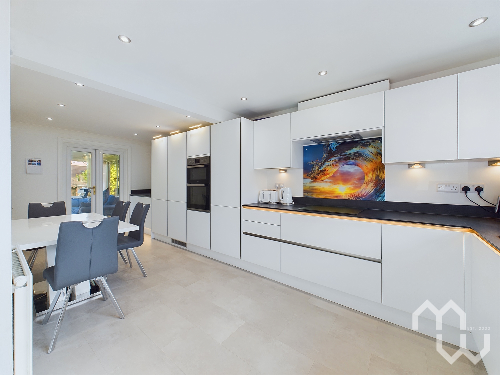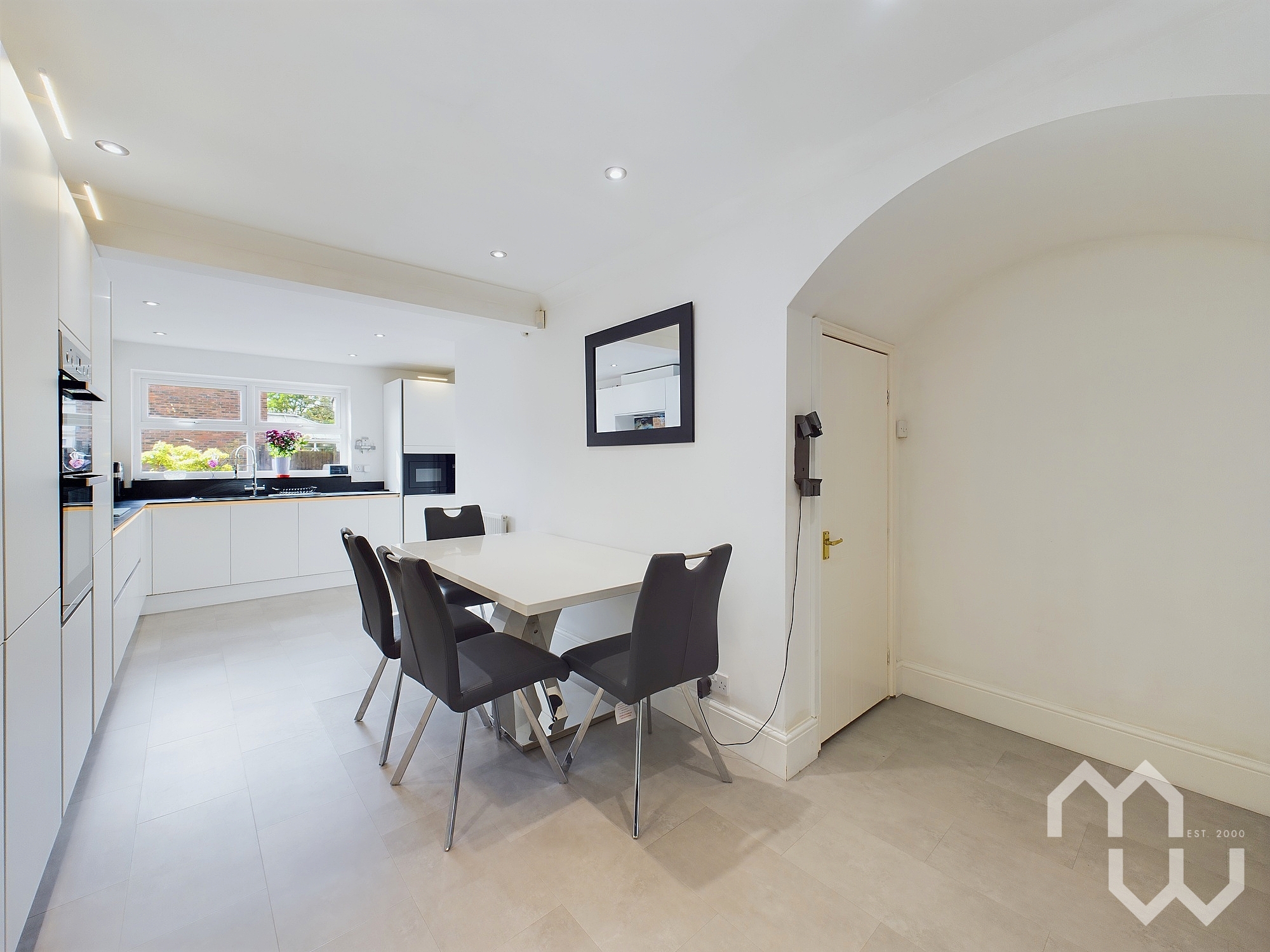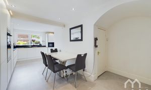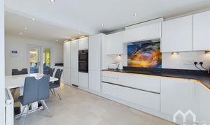 Excellent range of eye and low level units with integrated appliances including: dishwasher, fridge, freezer and electric oven with 1 1/2 sink. Additional storage under stairs. Karndean floor. Doors to orangery. Window to front.