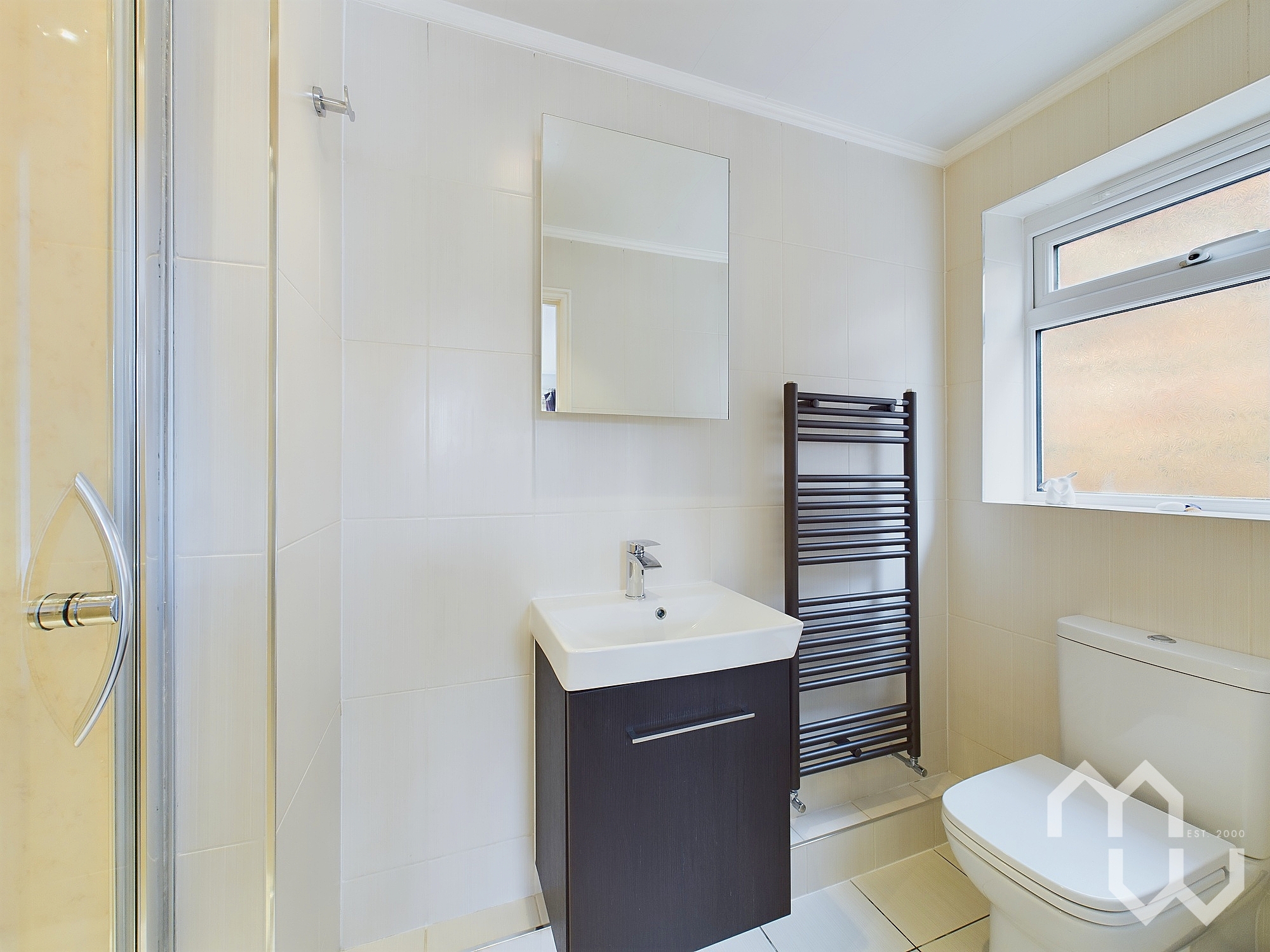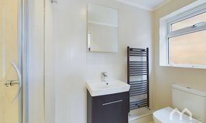 Three piece suite featuring walk-in cubicle with electric shower, wall mounted hand wash basin and W.C. Tiled floor and walls. Window to side.