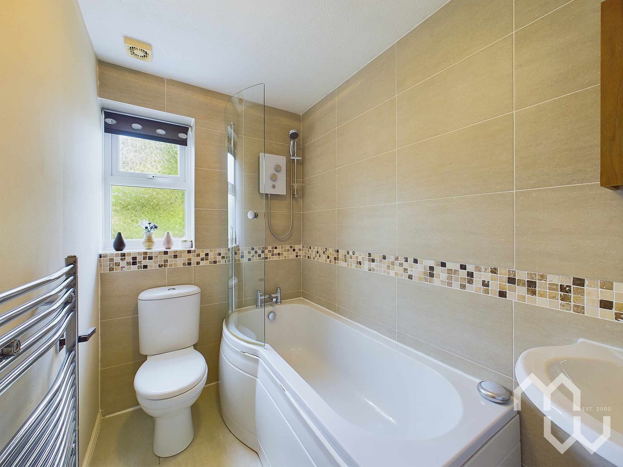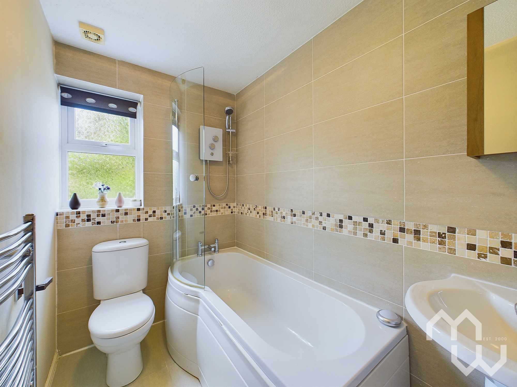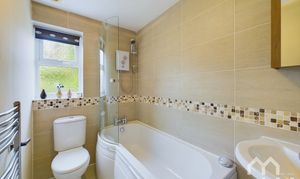 Three piece suite featuring panelled bath with electric shower over, pedestal hand wash basin, W.C. Tiled floor. Part tiled walls. Window to side.