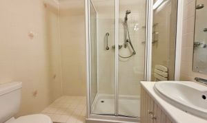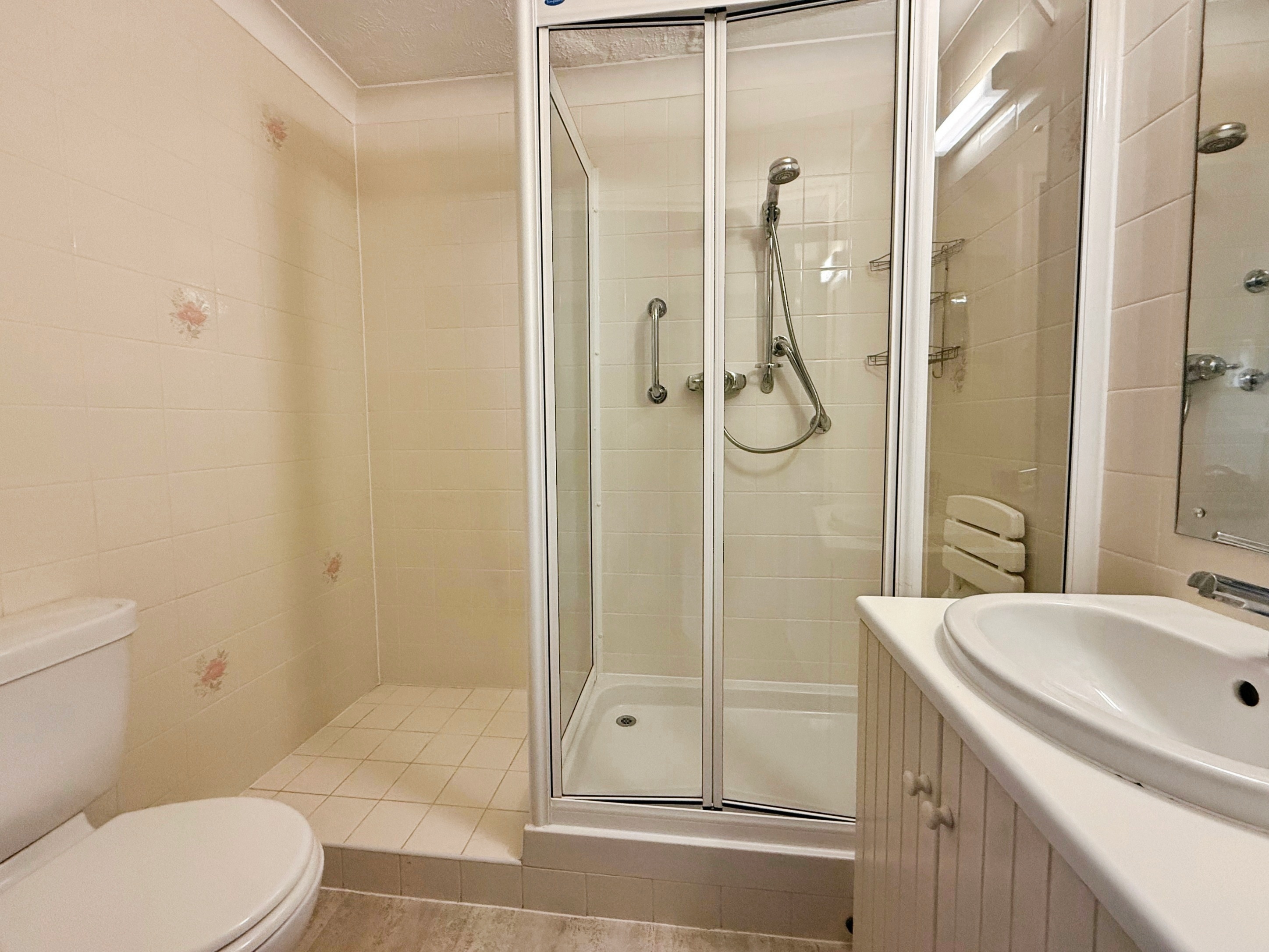 Laminate flooring, large shower cubicle, low level WC, wash hand basin with storage below, extractor fan.