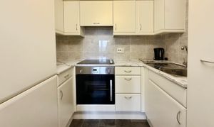 Lino flooring, range of matching wall and base units with in-built oven with in-built induction hob over and cooker hood above, worktop with stainless steel sink with side drainer, integral full height fridge/freezer.