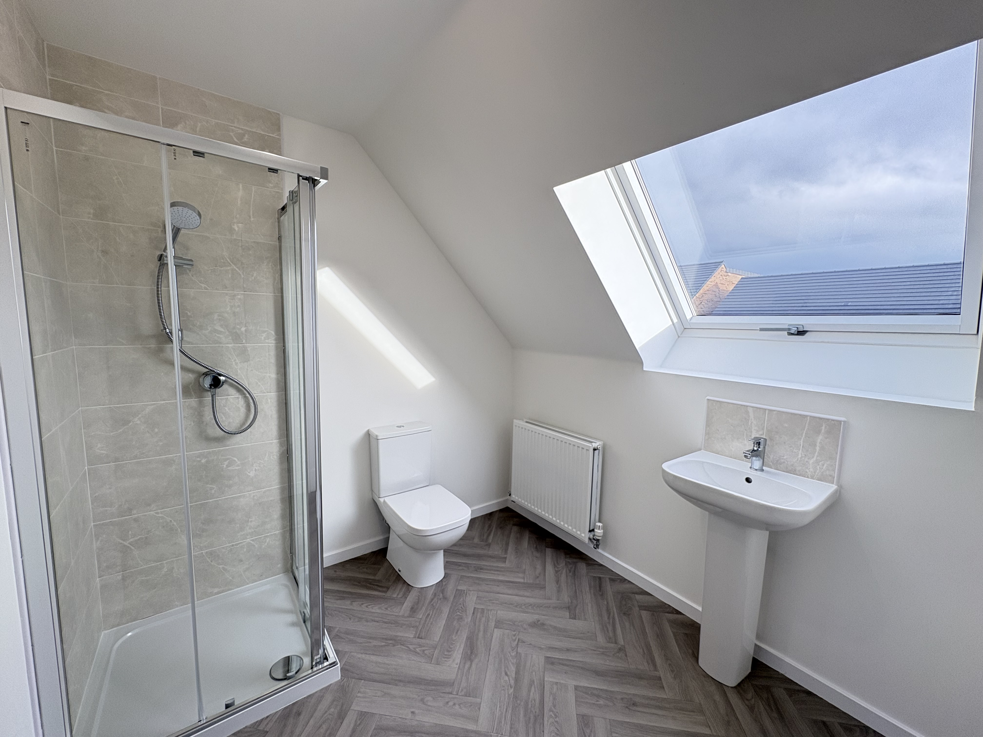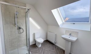 The top floor hosts a large master bedroom with a stylish en suite, including a shower cubicle, WC, and hand basin.