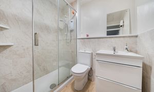 The recently fitted bathroom is modern and stylish, featuring a large, fully tiled walk-in shower.