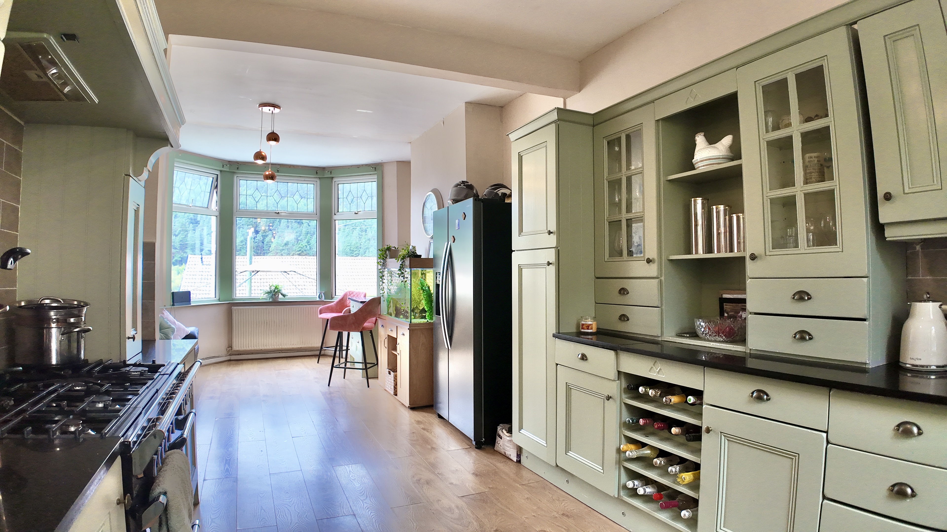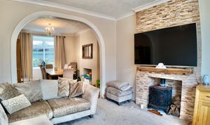 As you step inside, you'll be greeted by a spacious open-plan reception area that runs seamlessly from the front to the rear of the house. Both ends of this gorgeous room feature bay windows that flood the space with natural light, creating a warm and inviting atmosphere. Imagine cosy evenings by the log burner, creating a relaxing ambience for you and your loved ones.