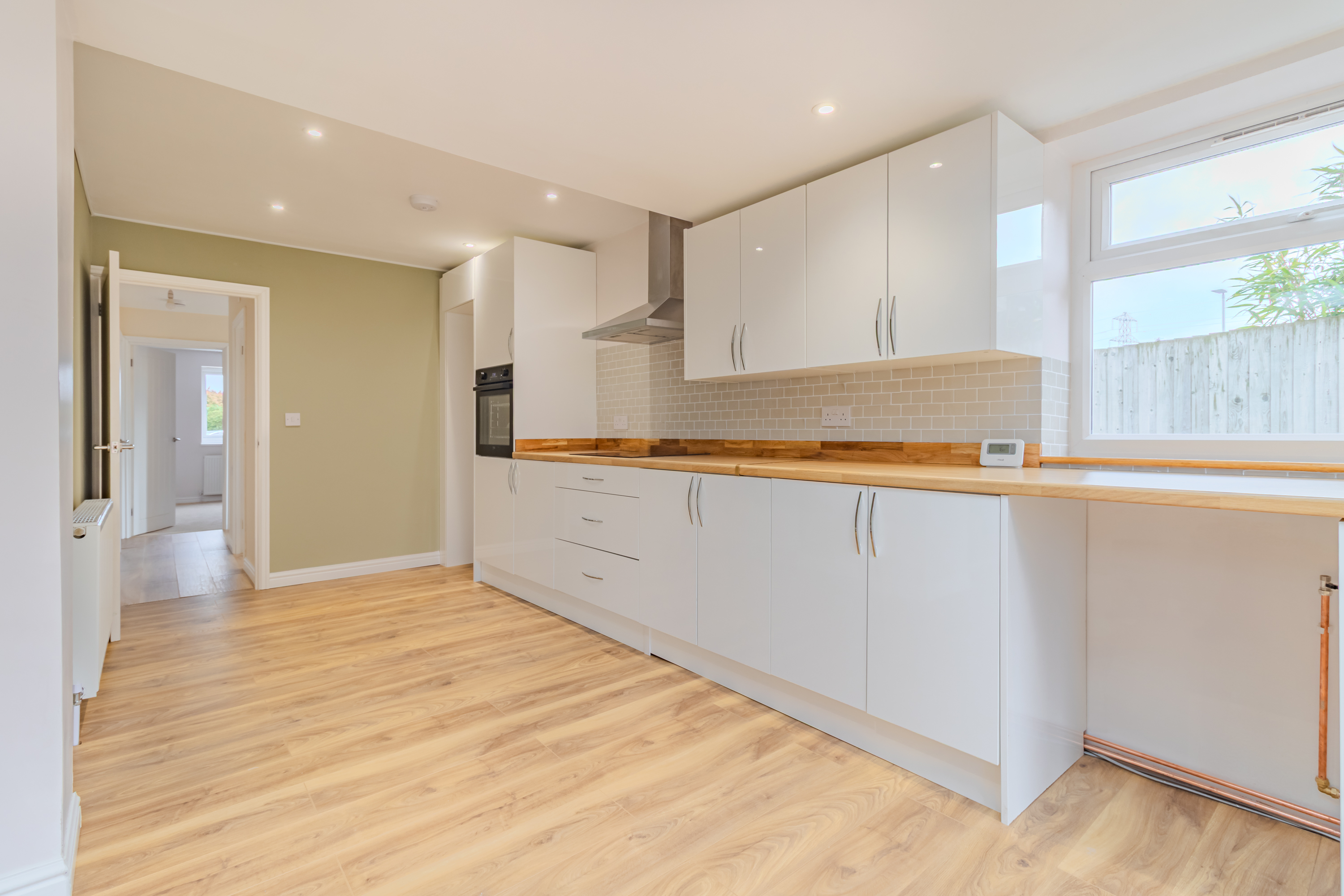 Upon entering, an inviting hallway leads you to three generously proportioned bedrooms, each designed to provide ample space and storage. The heart of this stunning home is its open plan dining kitchen, which has been finished to a high standard, featuring modern cabinetry, quality integrated appliances, and stylish work surfaces (perfect for both every-day family dining and entertaining guests). The open-plan layout allows for plenty of natural light, creating a bright and airy environment.