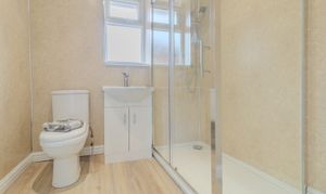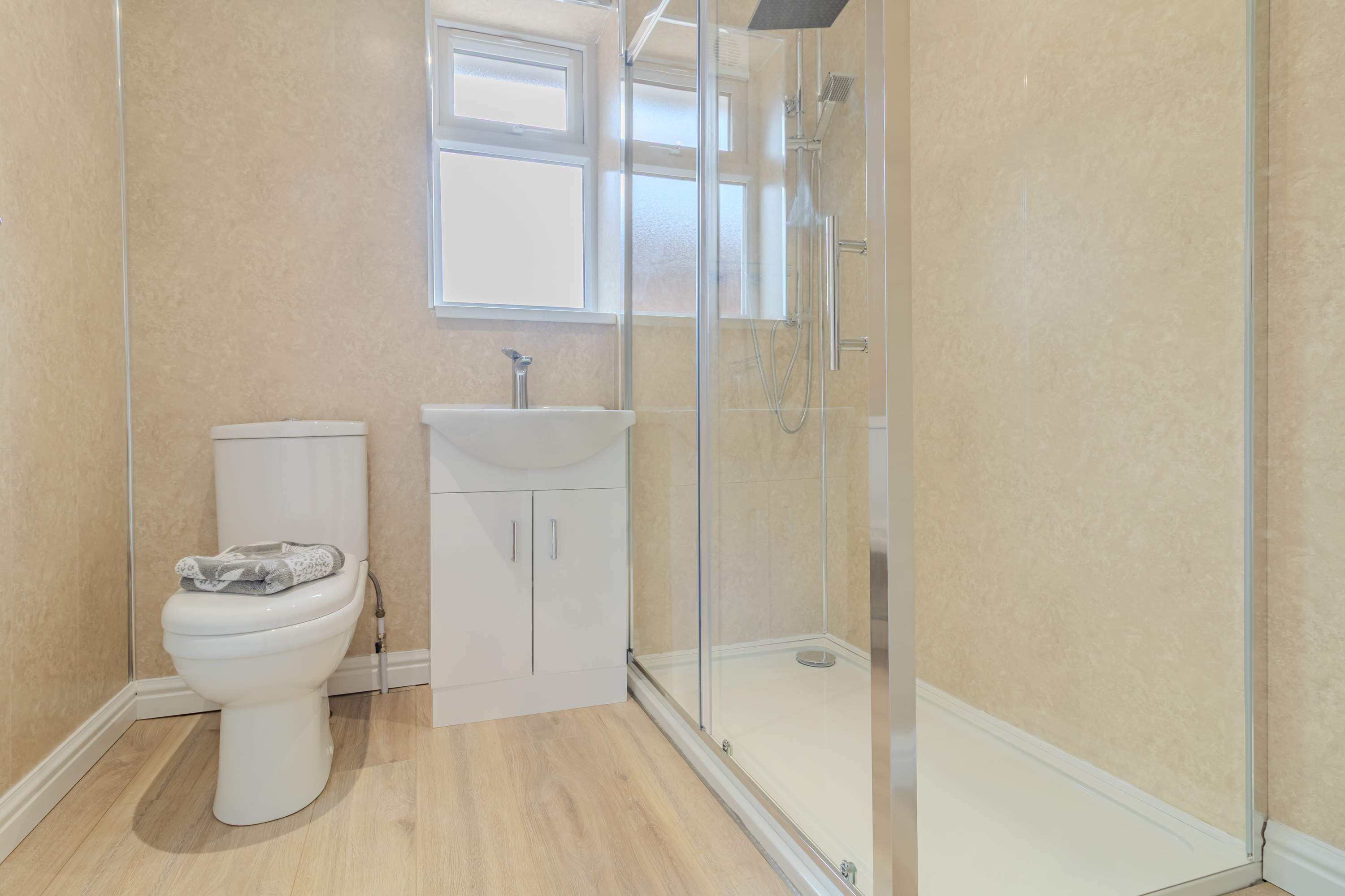 The living accommodation is further complemented by a well-appointed family bathroom which comprises of a white low-level WC, vanity unit with integrated basin and chrome mixer tap, and a fully enclosed corner shower cubicle with sliding glass doors and chrome fittings.