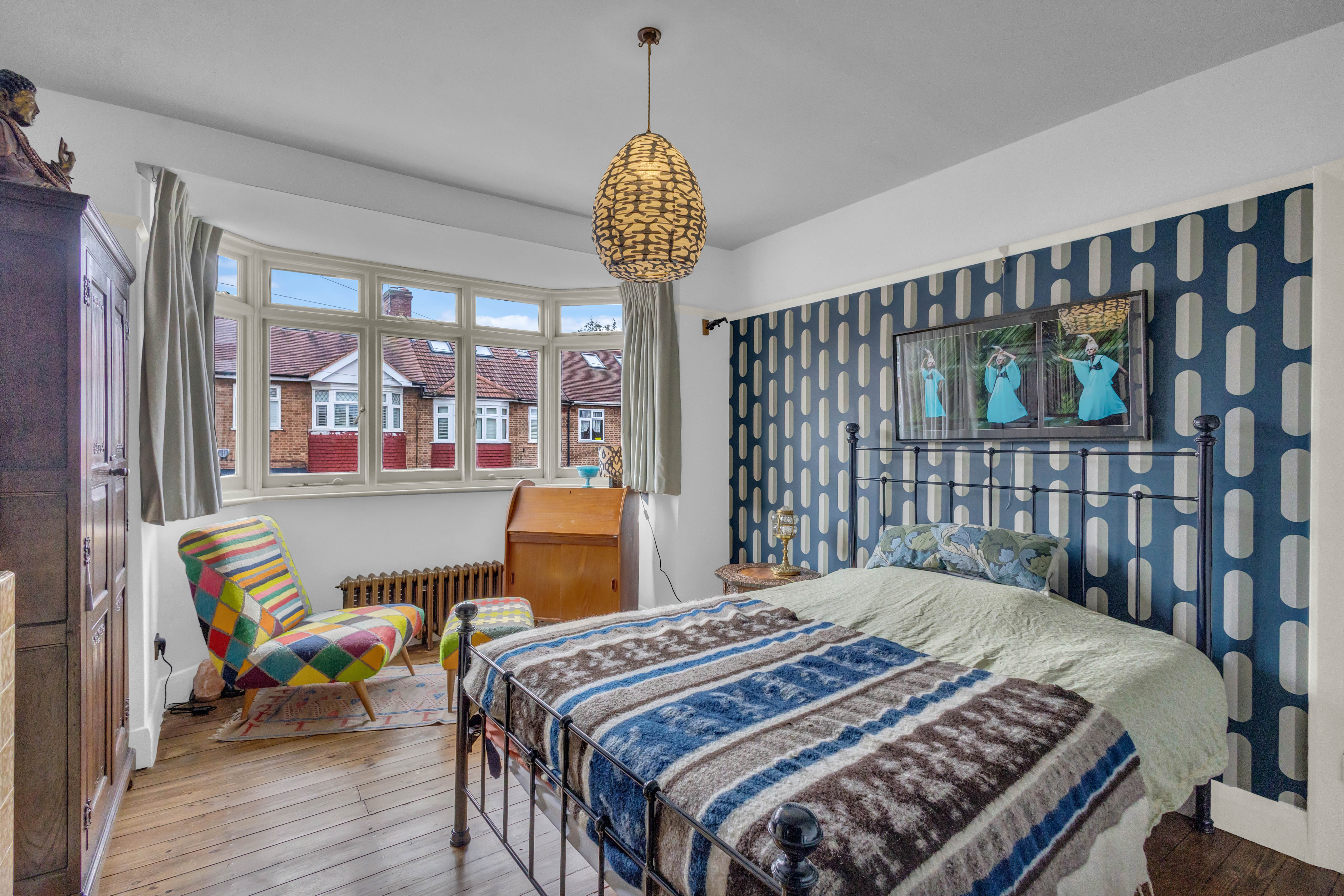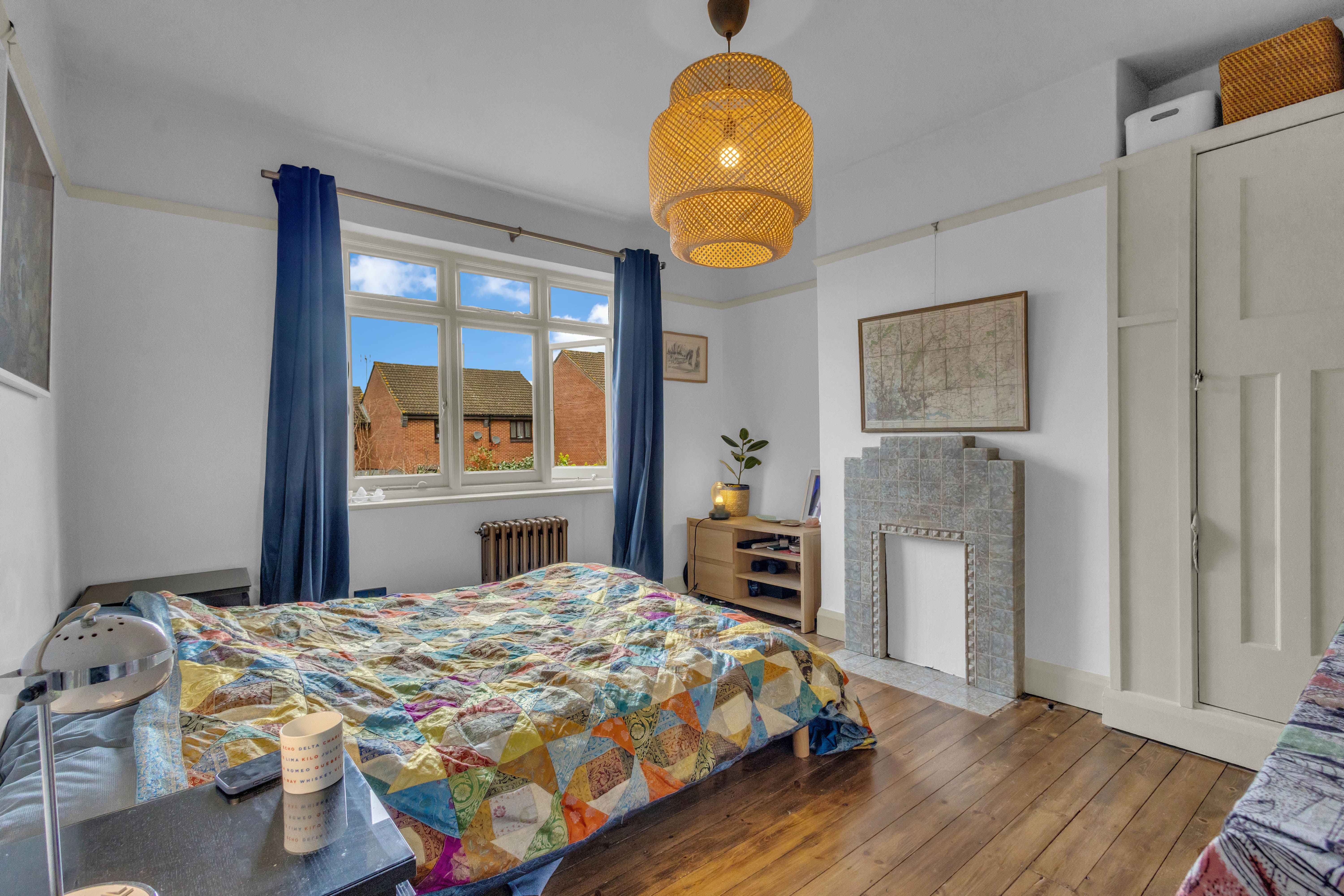 Upstairs, the landing leads to three bedrooms and the family bathroom. The principal bedroom is positioned at the front of the home and benefits from the bay window. A second generous bedroom sits to the rear, overlooking the garden, and also has a fireplace.