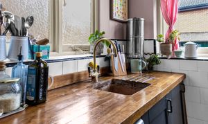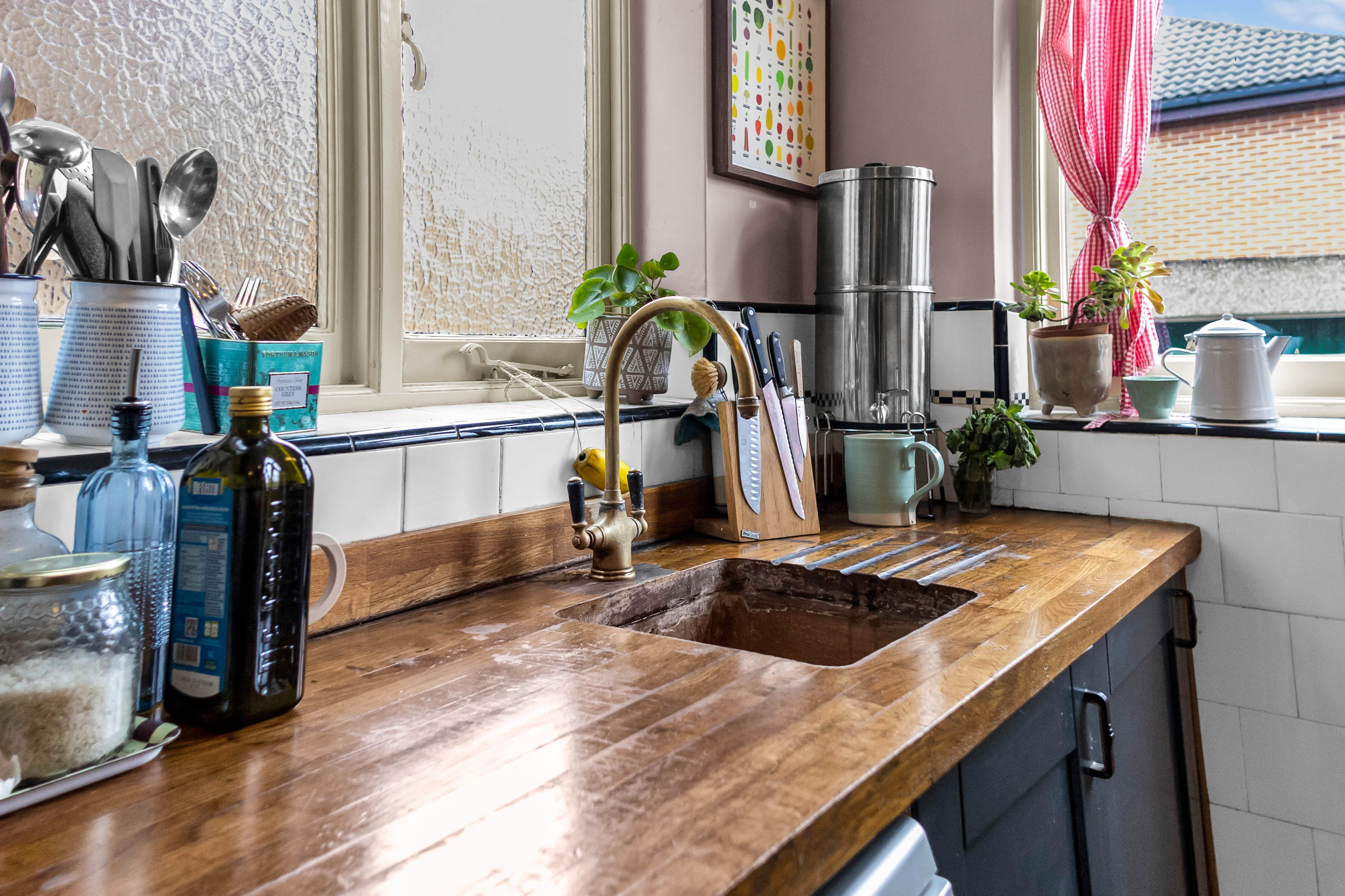 To the rear, the kitchen provides a practical workspace with distinctive character details including original tiles and a vintage French copper sink with traditional fittings. A ground floor WC sits conveniently off the hallway.