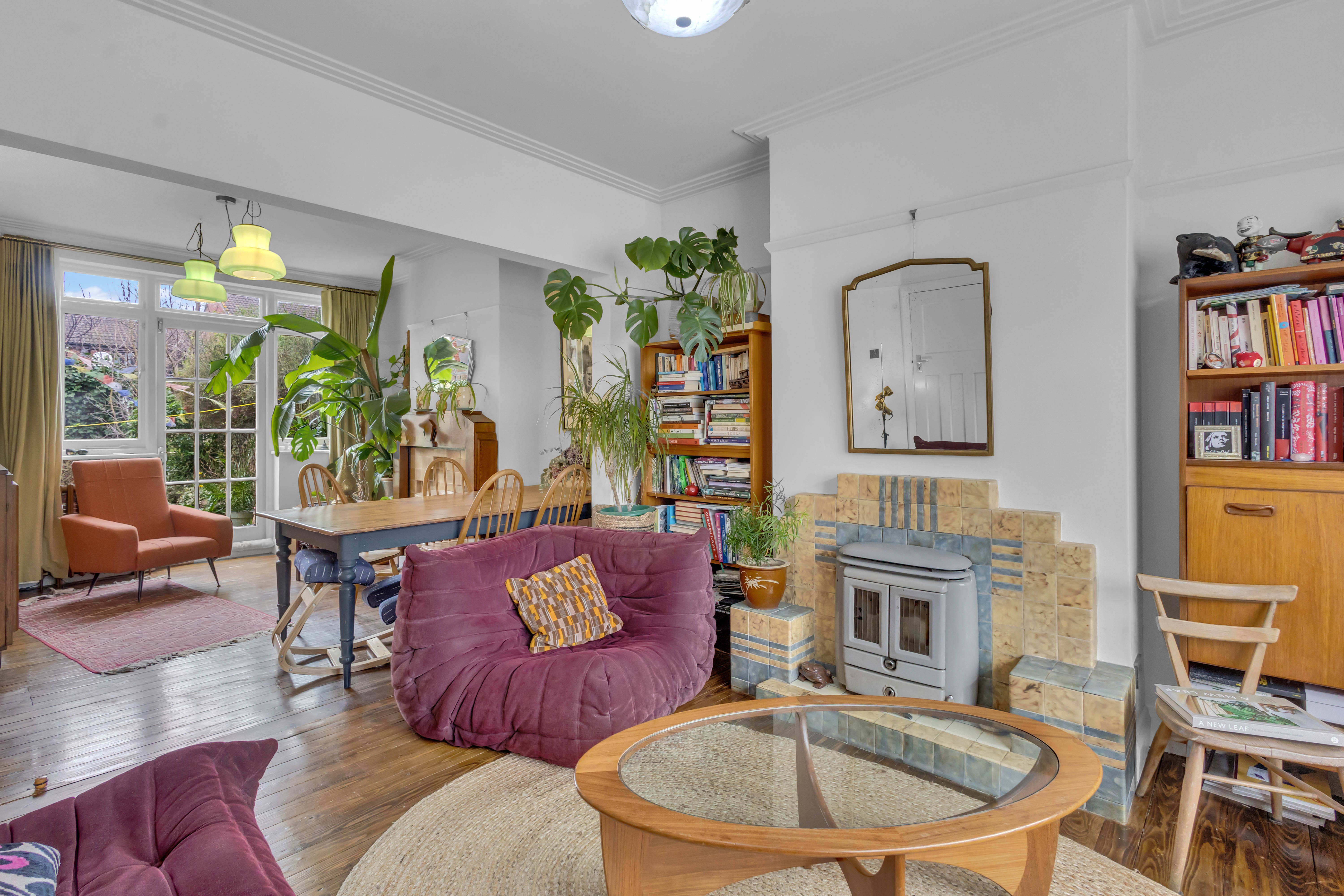 The property opens into a central entrance hall with stairs leading to the first floor and access to the main living spaces. At the front of the home, the lounge enjoys a striking bay window and excellent natural light throughout the day thanks to the south-facing front garden. This inviting room also features one of the home’s original 1930s fireplaces, complete with period tiles, and one has a striking original mahogany mantelpiece.