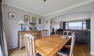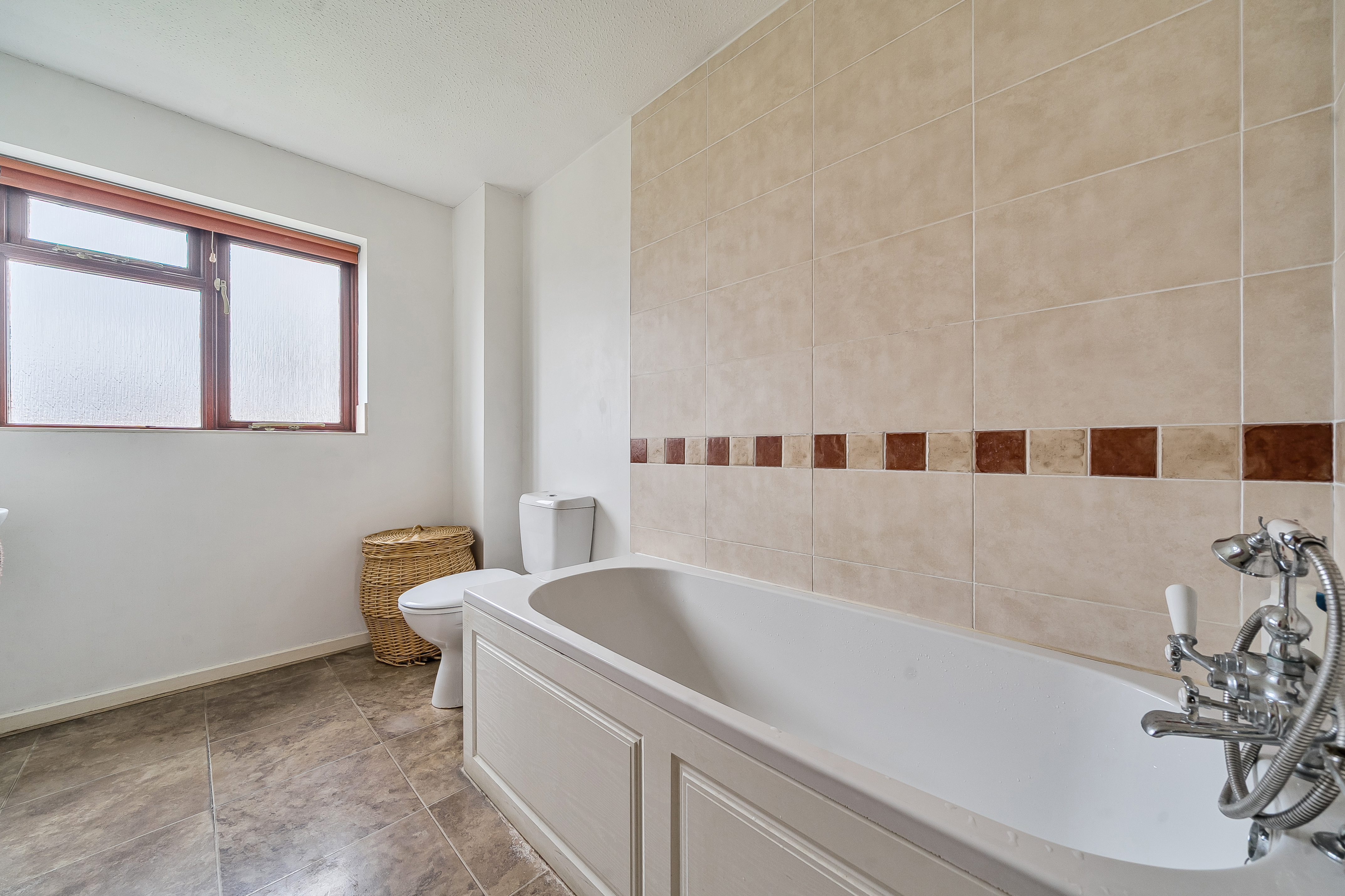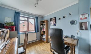 The entrance hall leads to a generous double-aspect living/dining room featuring a fireplace and doors opening onto a patio overlooking the well-maintained rear garden. The fitted kitchen/breakfast room also enjoys garden views. There is a further reception room which would make an ideal study/home office or additional bedroom and a separate cloakroom.