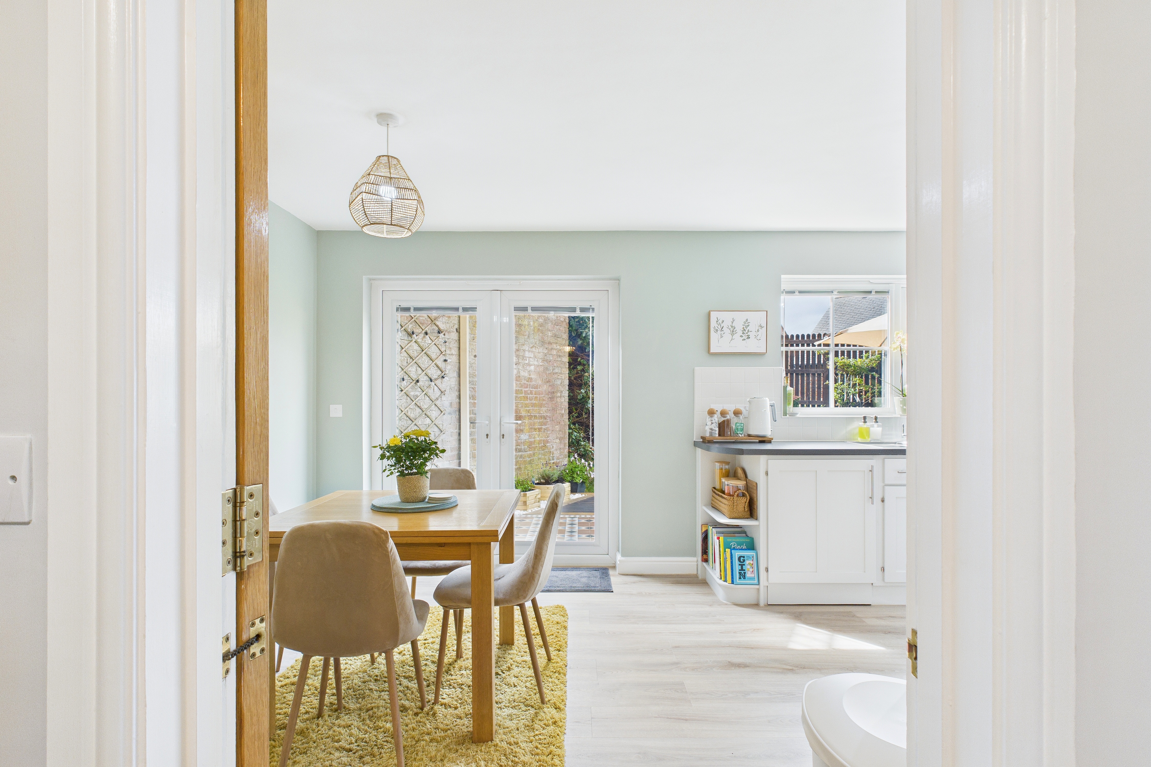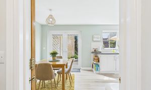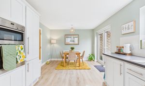 - Eye catching, solid oak kitchen with plenty of storage and a dining area with French doors