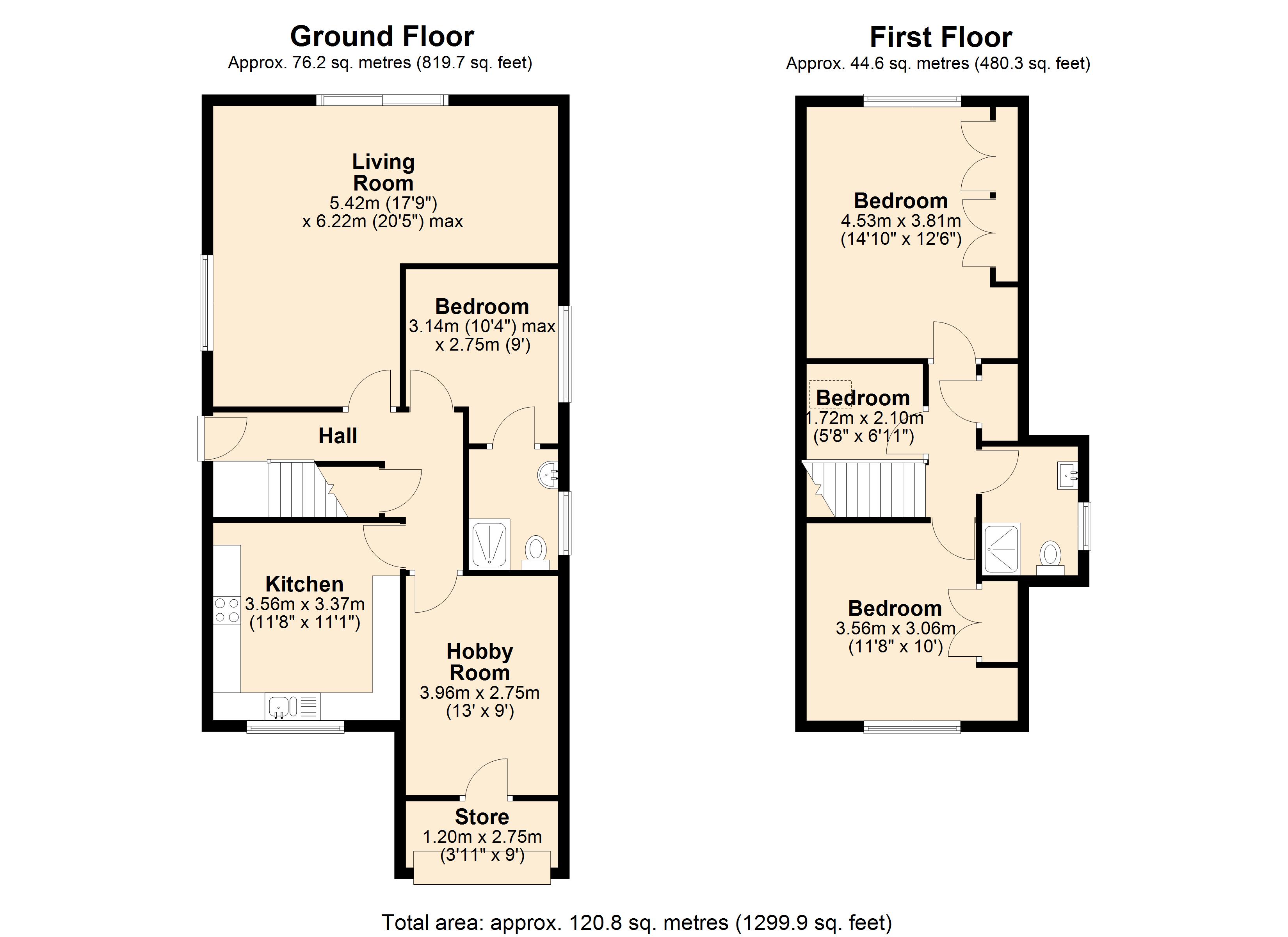 The first floor is completed by a modern bathroom fitted with a shower, toilet, and wash basin, finished in a clean, contemporary style.
