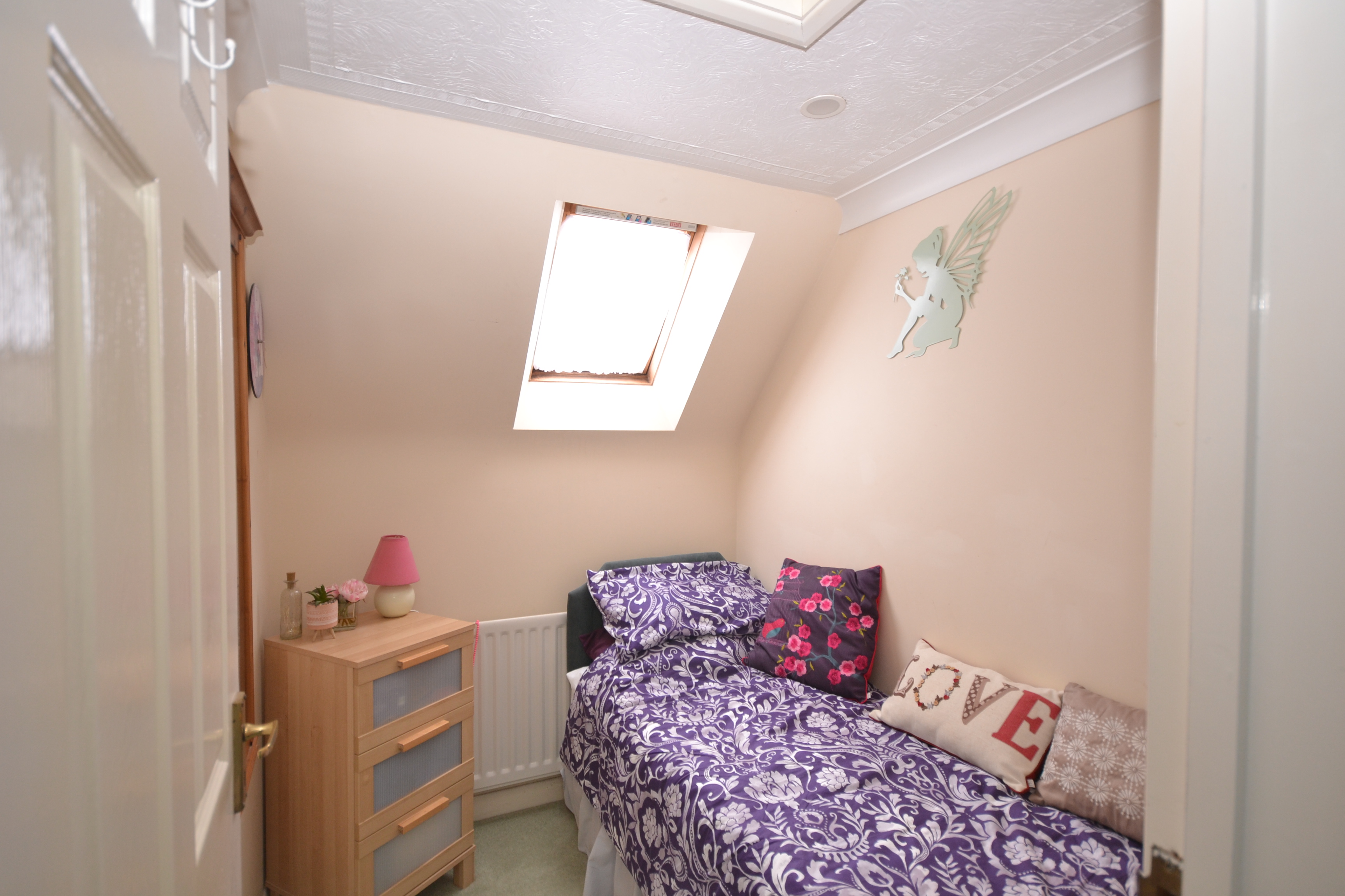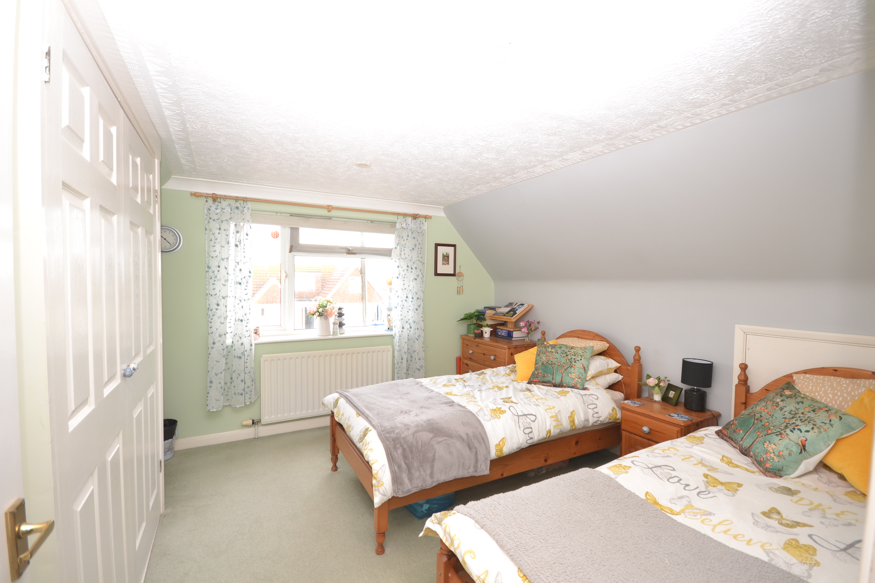 To the first floor, the landing offers further built‑in storage and leads to a range of well‑proportioned bedrooms. One double bedroom features fitted storage and enjoys attractive views over the reserve, while another bedroom provides excellent flexibility, ideal as a guest room or a versatile home office.