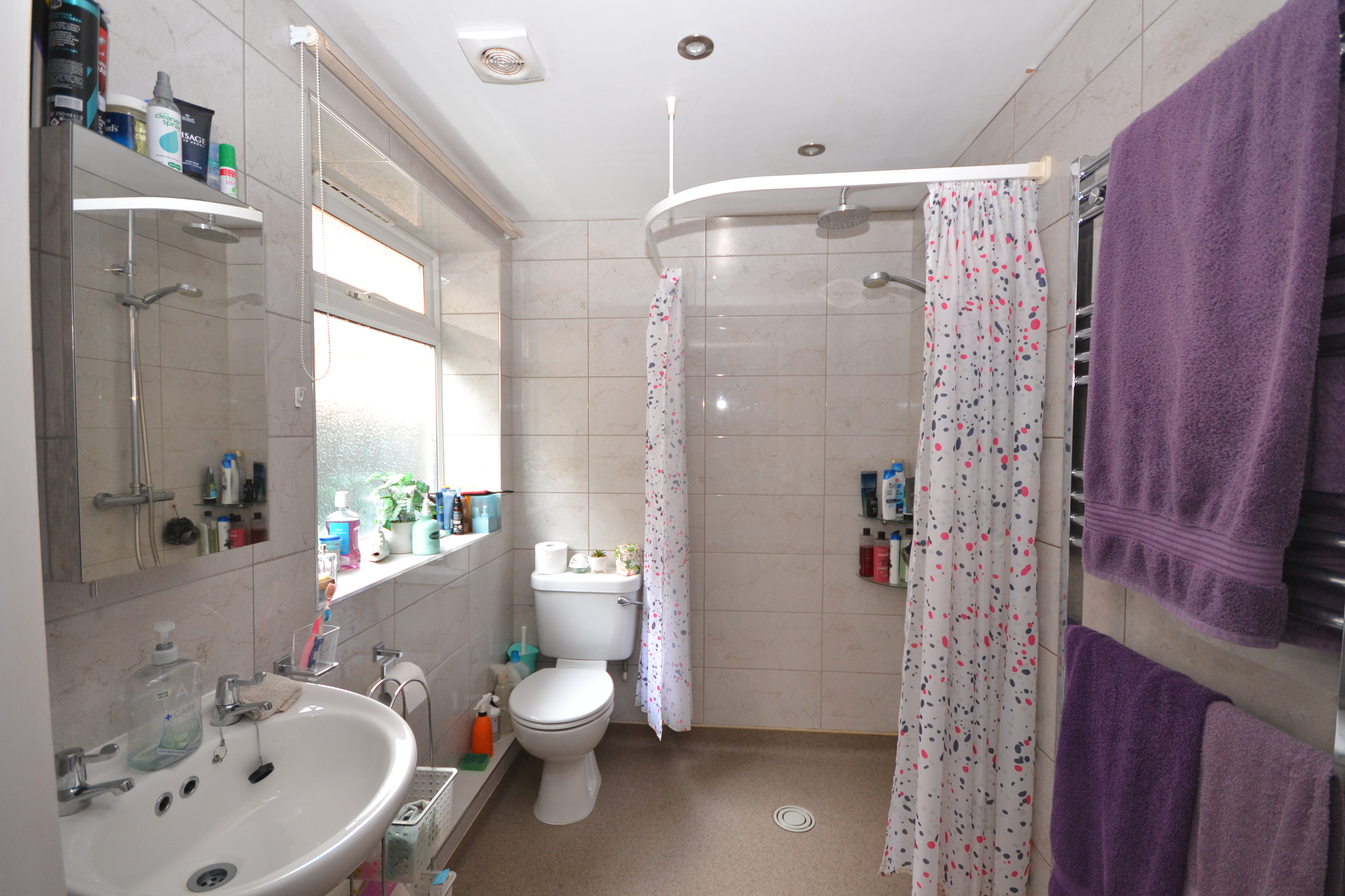 A pretty ground‑floor bedroom served by an accessible wet‑room style shower room, ideal for guests or flexible living arrangements.