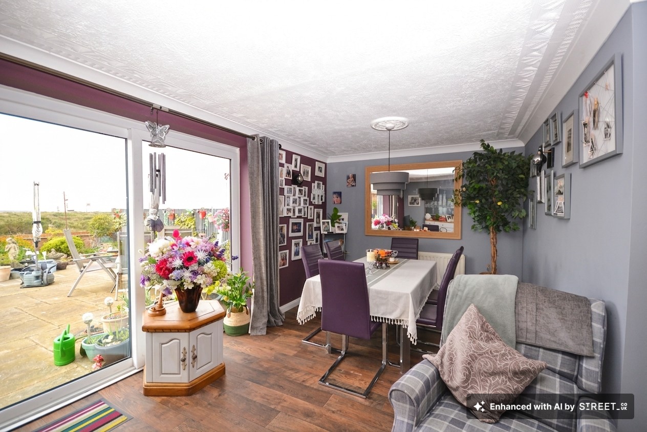 A spacious lounge/dining room enjoying lovely views across the garden and adjoining SSSI (Site of Special Scientific Interest), creating a bright, tranquil living space with a strong connection to the natural surroundings.