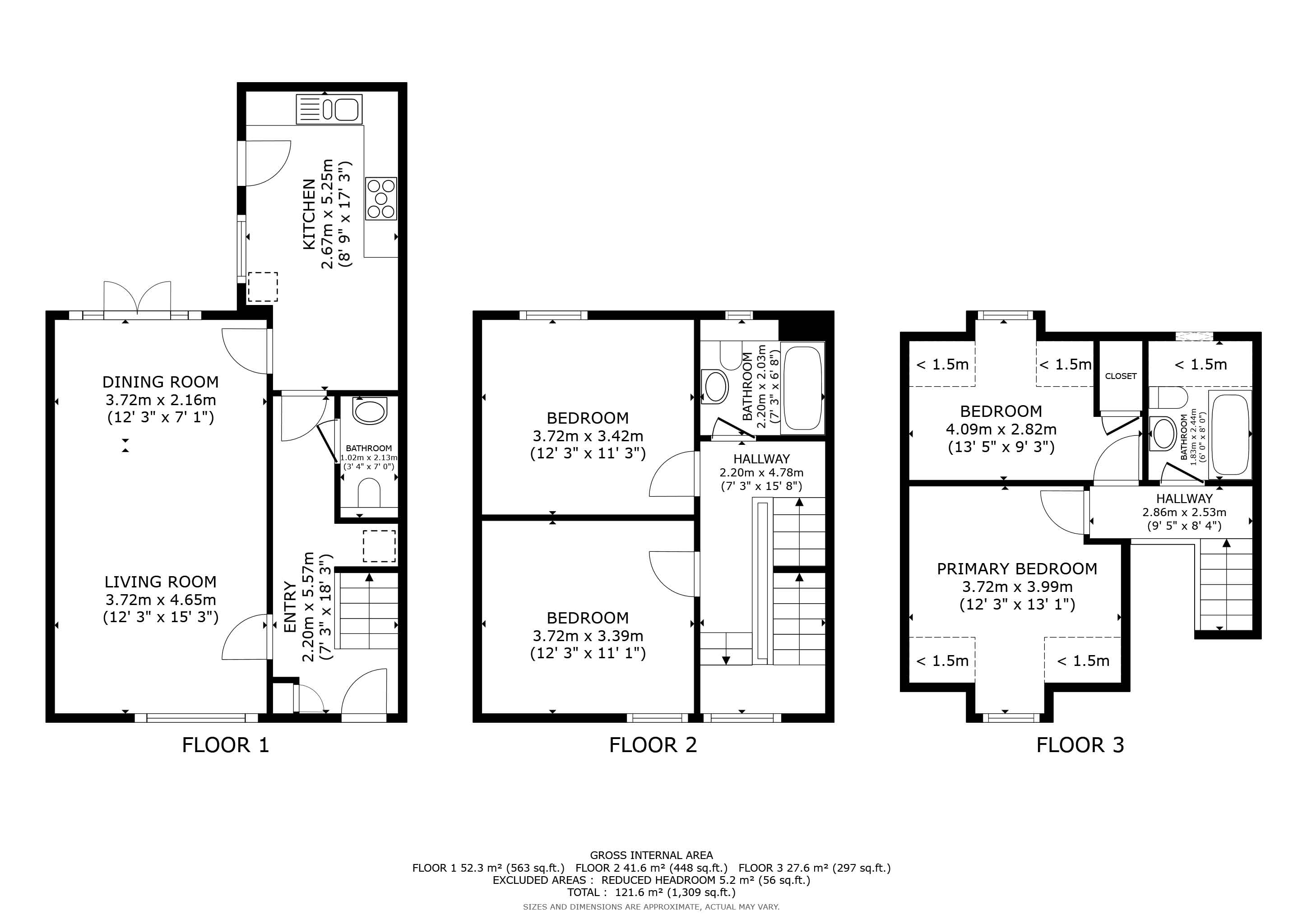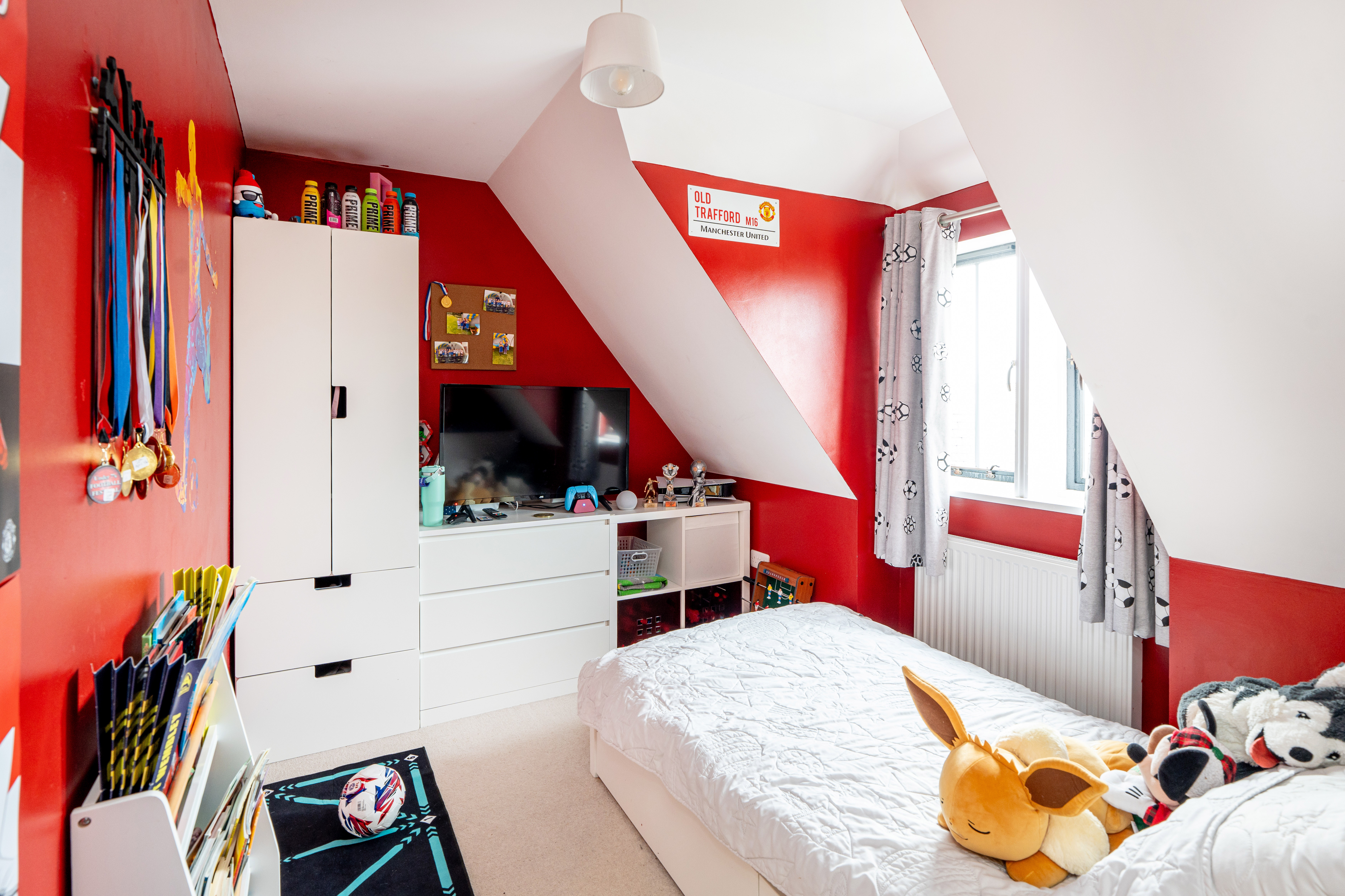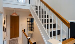 On the first floor, there is a family bathroom and two double bedrooms, including the large principal bedroom. A bright stairwell with high ceilings leads to the second floor, where there are two additional bedrooms and a second bathroom.