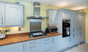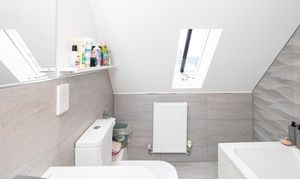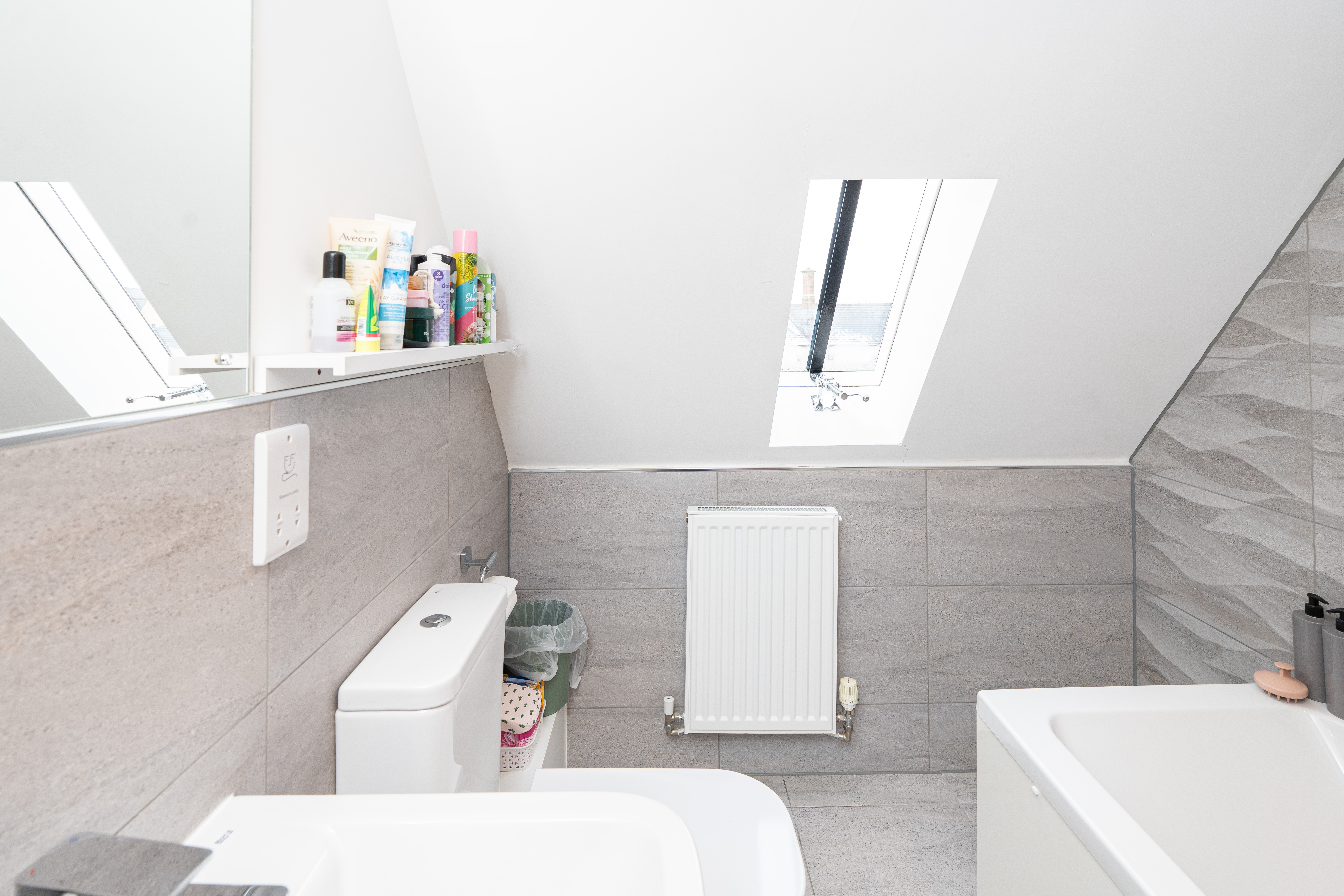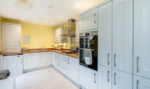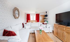 On approach, the home immediately captures attention with its elegant stone mullion windows and distinctive chimney feature. Inside, a spacious entrance hall with adjoining WC leads to a bright, dual-aspect reception room featuring French doors opening onto the rear garden. The large kitchen is fitted with high-quality Bosch appliances, classic shaker-style cabinetry, generous storage, and provides further access to the garden.