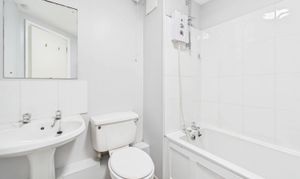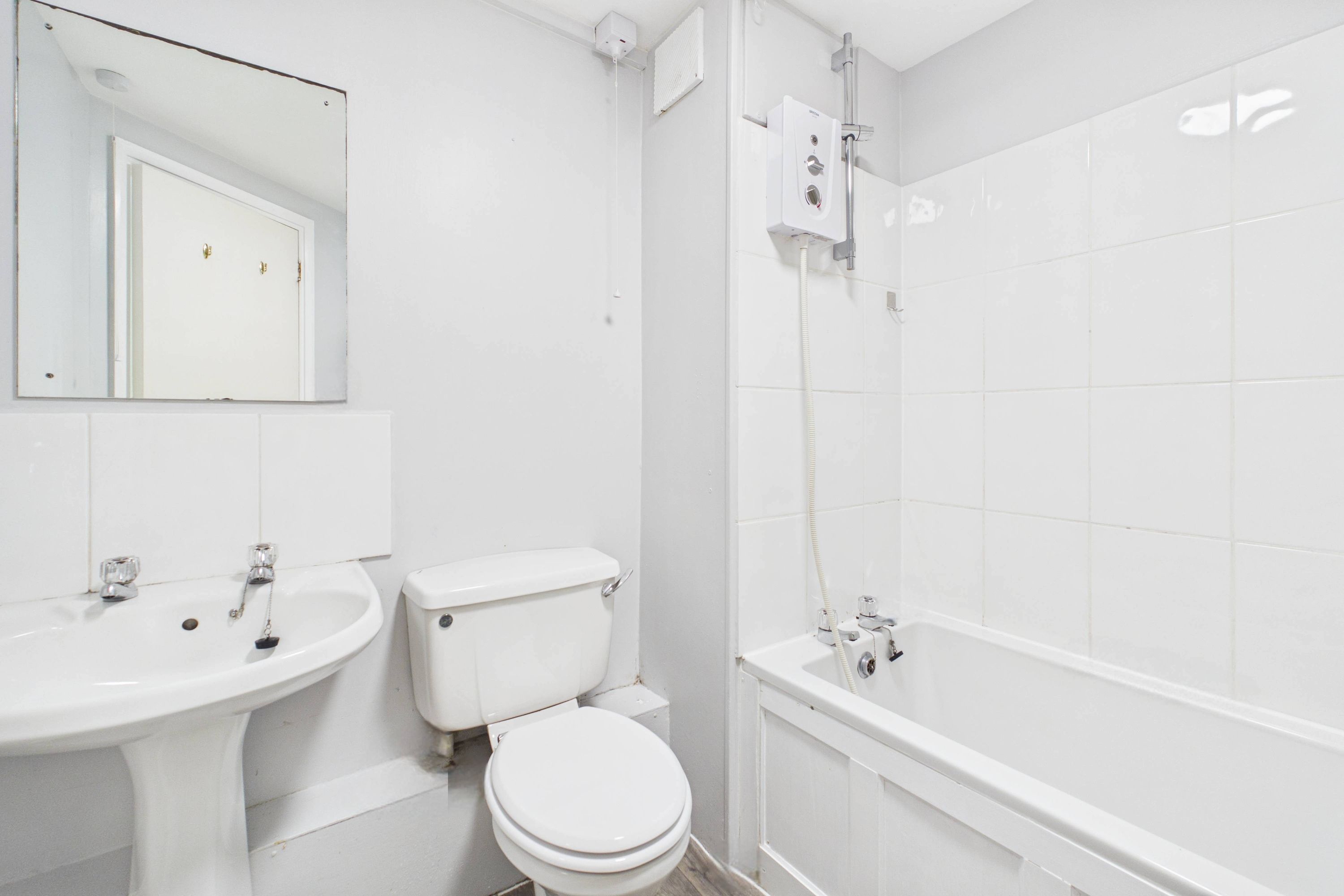 Both max. Heated towel radiator, three piece suite comprises W.C. wash hand basin and bath with electric shower over, partial tiling to walls, extractor fan.
