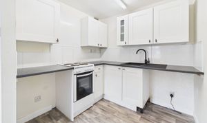Both max. Base and wall units, sink, integrated oven with electric hob, space for fridge freezer, tiled splashback.