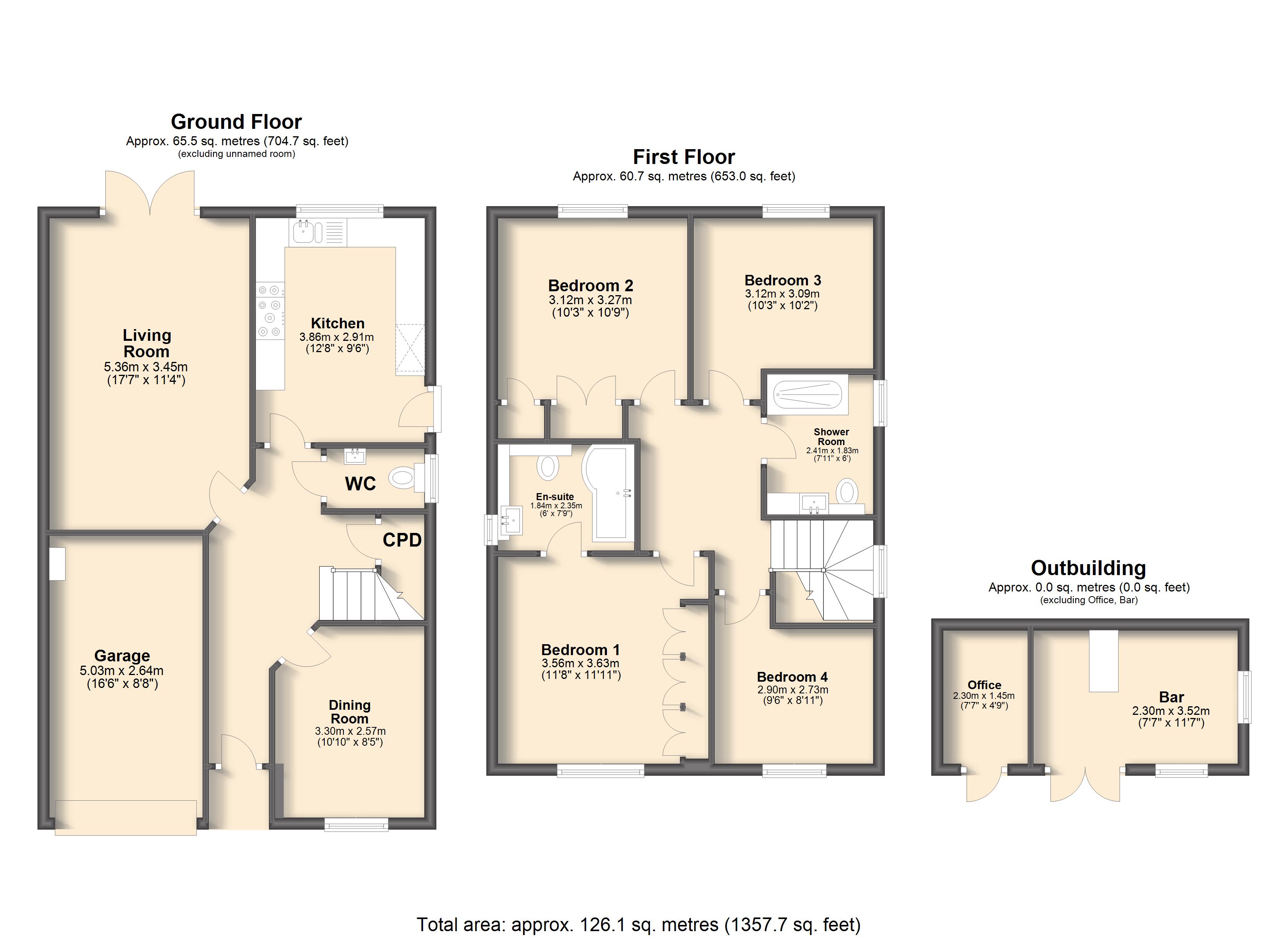 Upstairs, the property boasts four well-appointed bedrooms. The principal bedroom benefits from fitted wardrobes and an en-suite bathroom. The remaining bedrooms are all of good proportions, offering flexibility for family life. A shower room, fitted with a three-piece suite, completes the first floor.