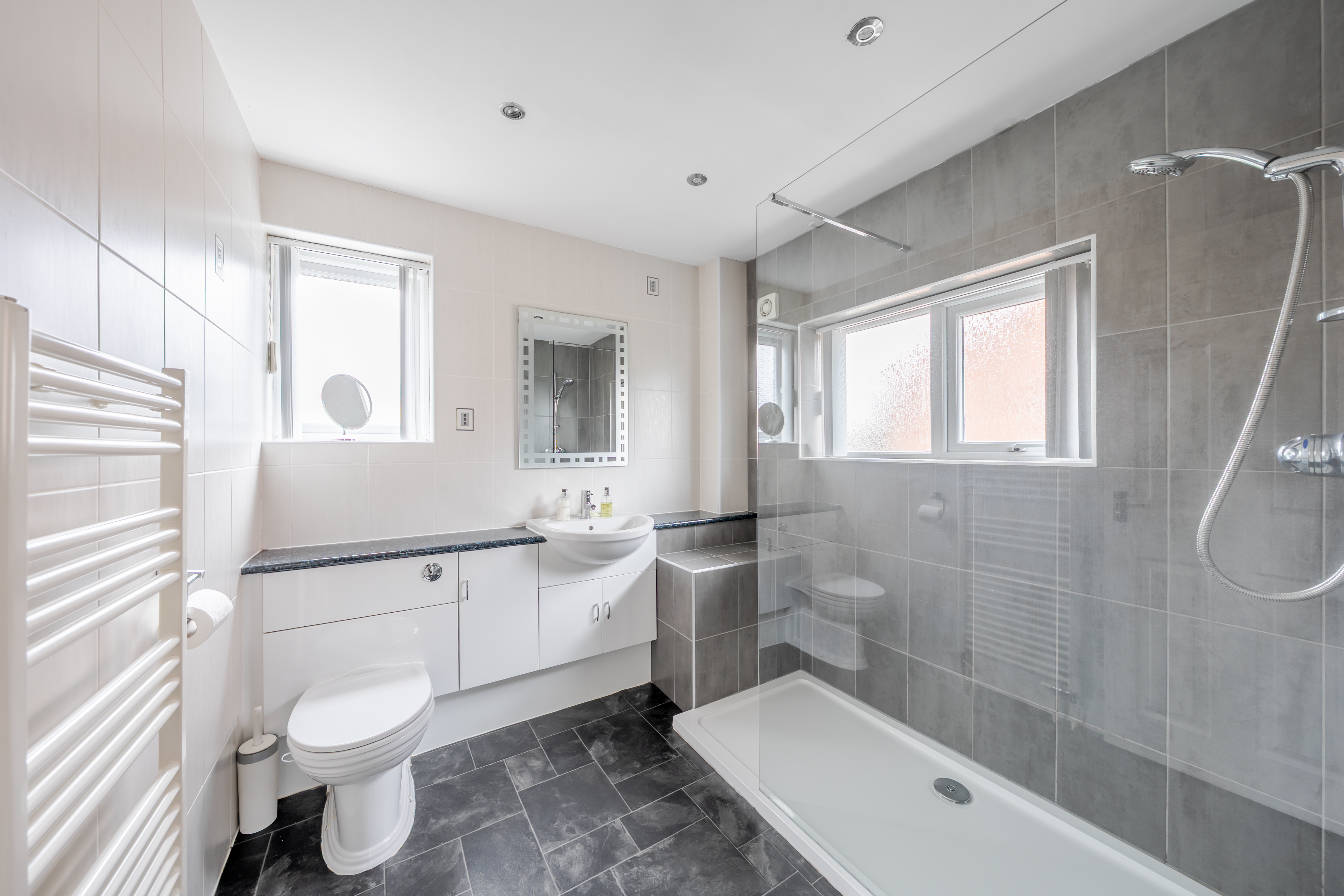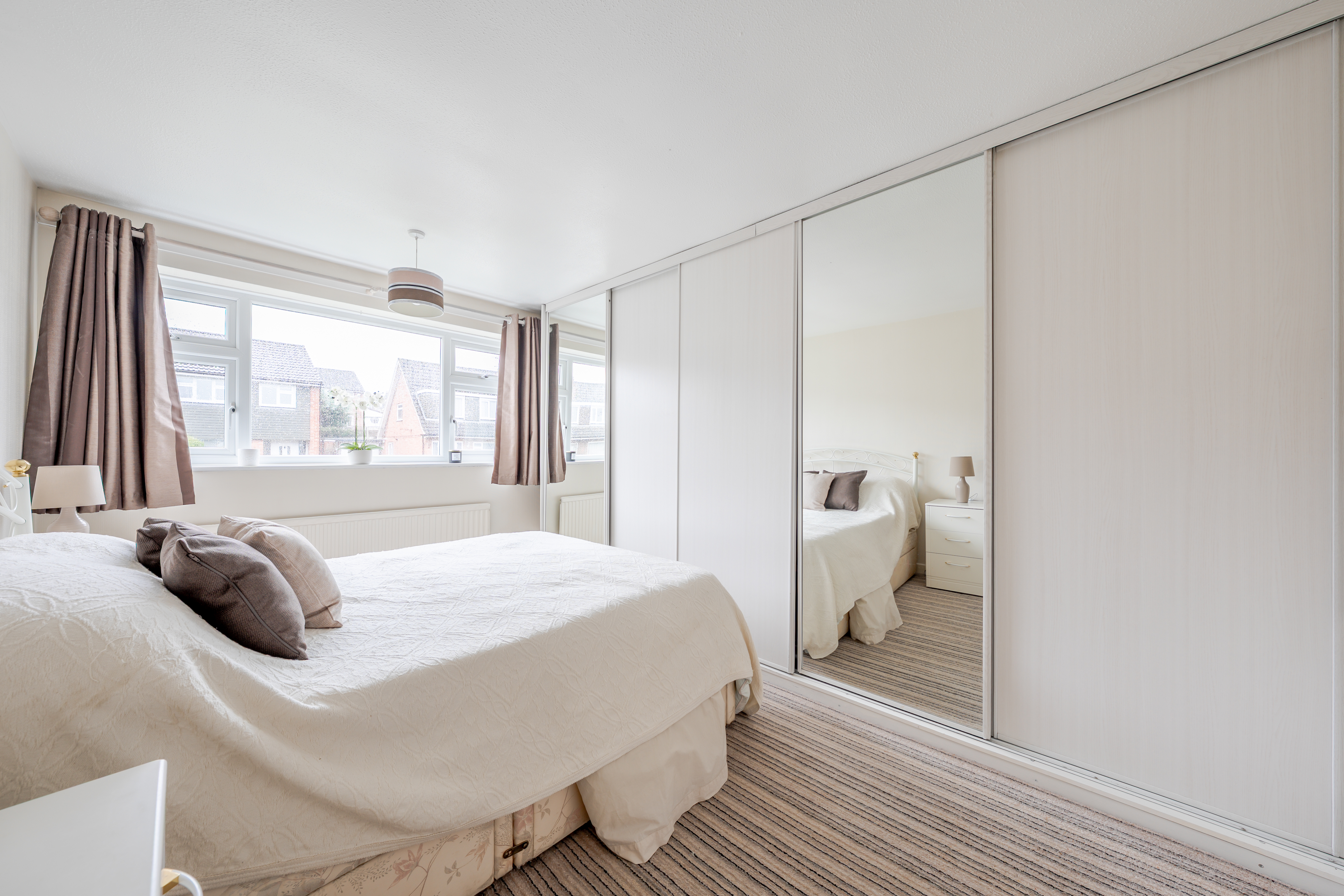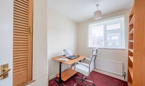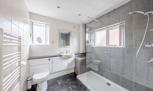 Upstairs, two spacious and airy double bedrooms, both with generous built-in wardrobes, are served by a contemporary family bathroom with a large walk-in shower and modern tiling. A third single bedroom provides flexibility for use as a home office, nursery, or playroom.