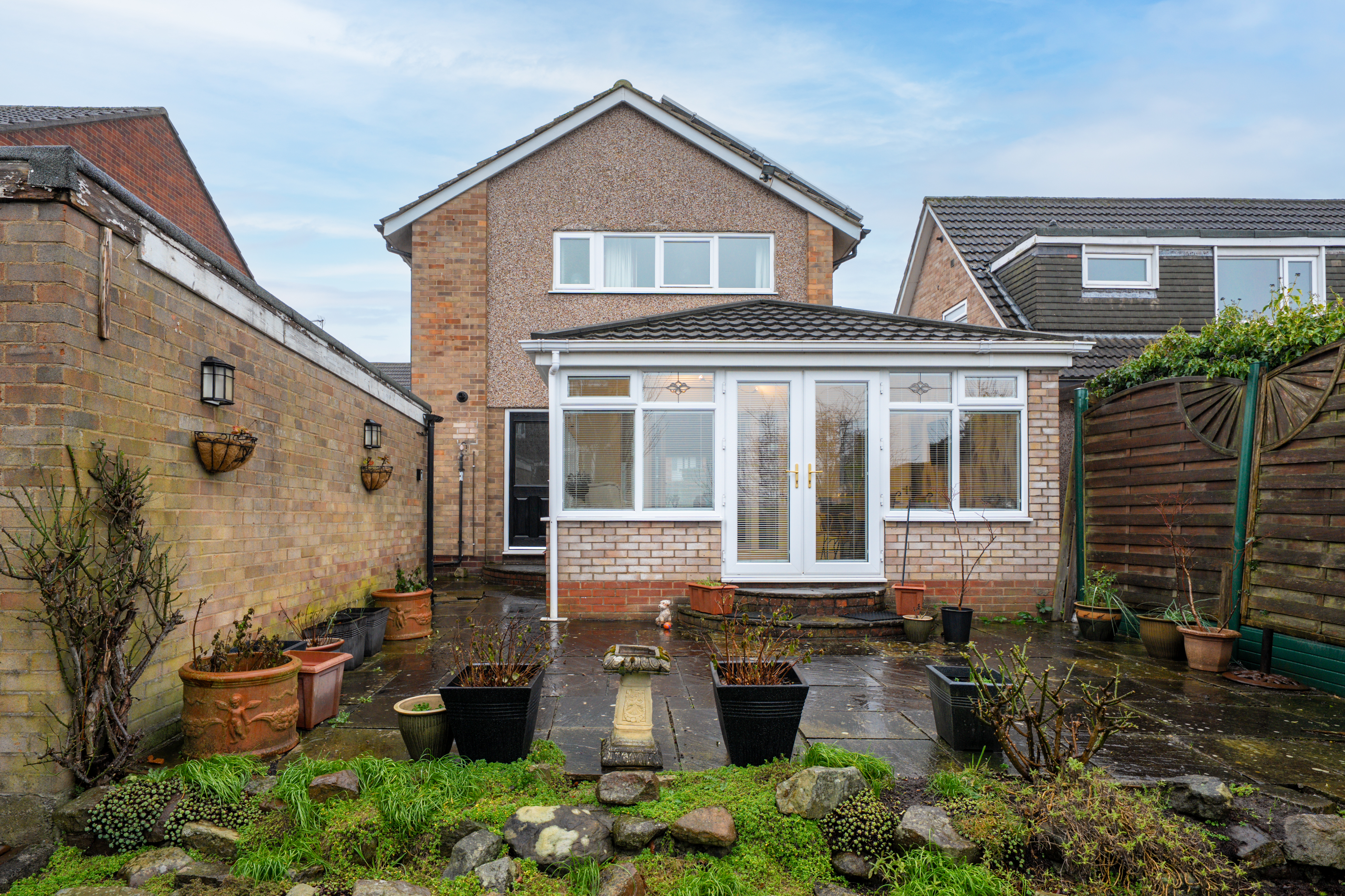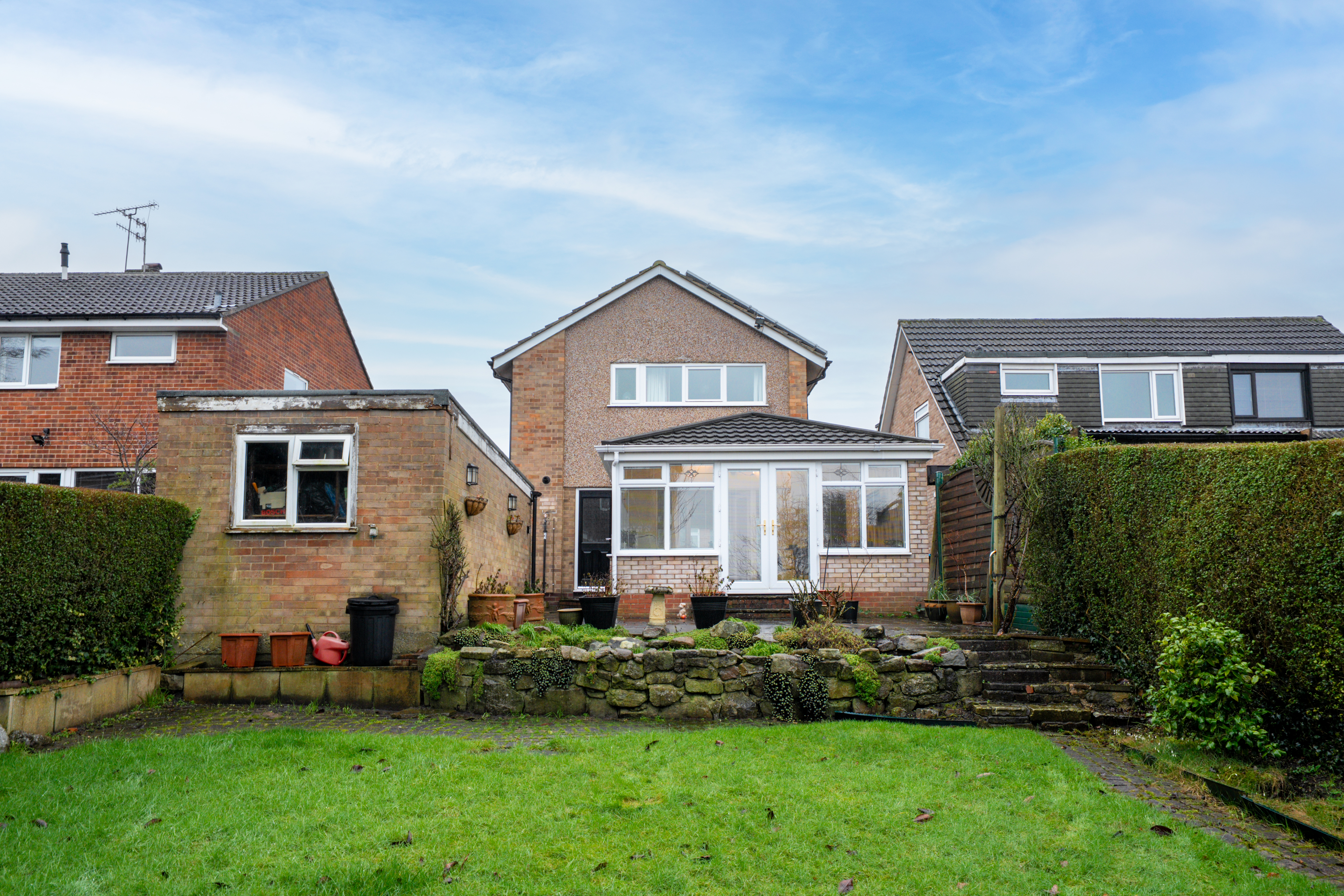 Excellent front and rear gardens, bordered by neat hedging both sides. The rear garden has a lovely patio area and mature stocked planting beds.