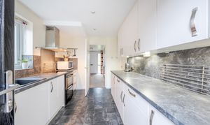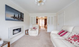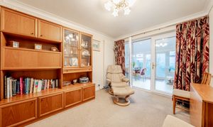 Inside, a welcoming entrance hall leads to a bright living room on the left, featuring a cosy gas fire and elegant ceiling cornicing that continues seamlessly through to the adjoining dining room. The dining room offers ample space for a table and chairs and is accessed via sliding doors, with French doors opening through to a wonderful garden room. This versatile space comfortably accommodates both dining and seating areas and benefits from attractive ceiling spotlights. A useful ground-floor WC is accessed from the garden room. Completing the ground floor is a light-filled kitchen with plentiful storage and a door opening directly onto the rear garden, providing an additional access point alongside the garden room.
