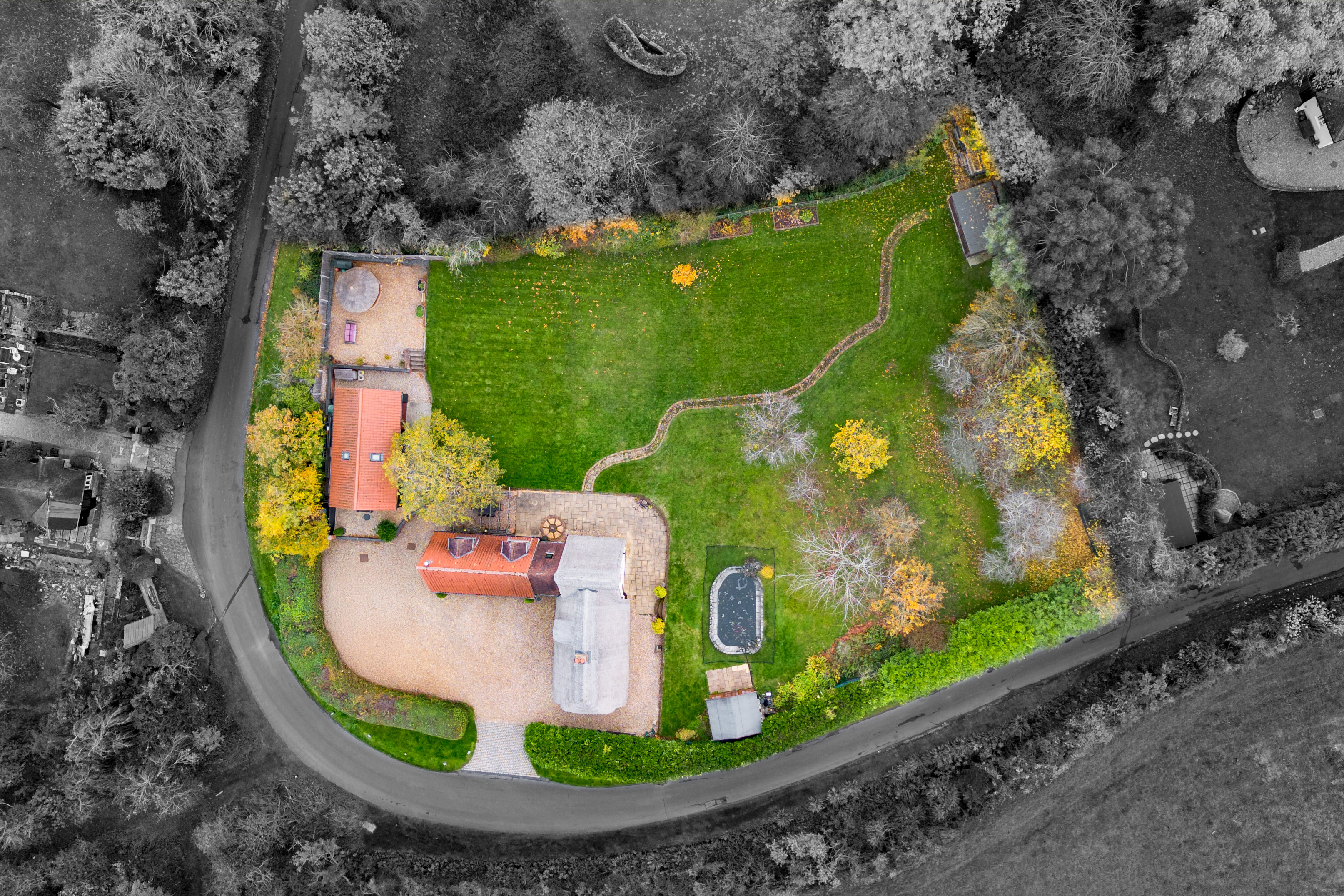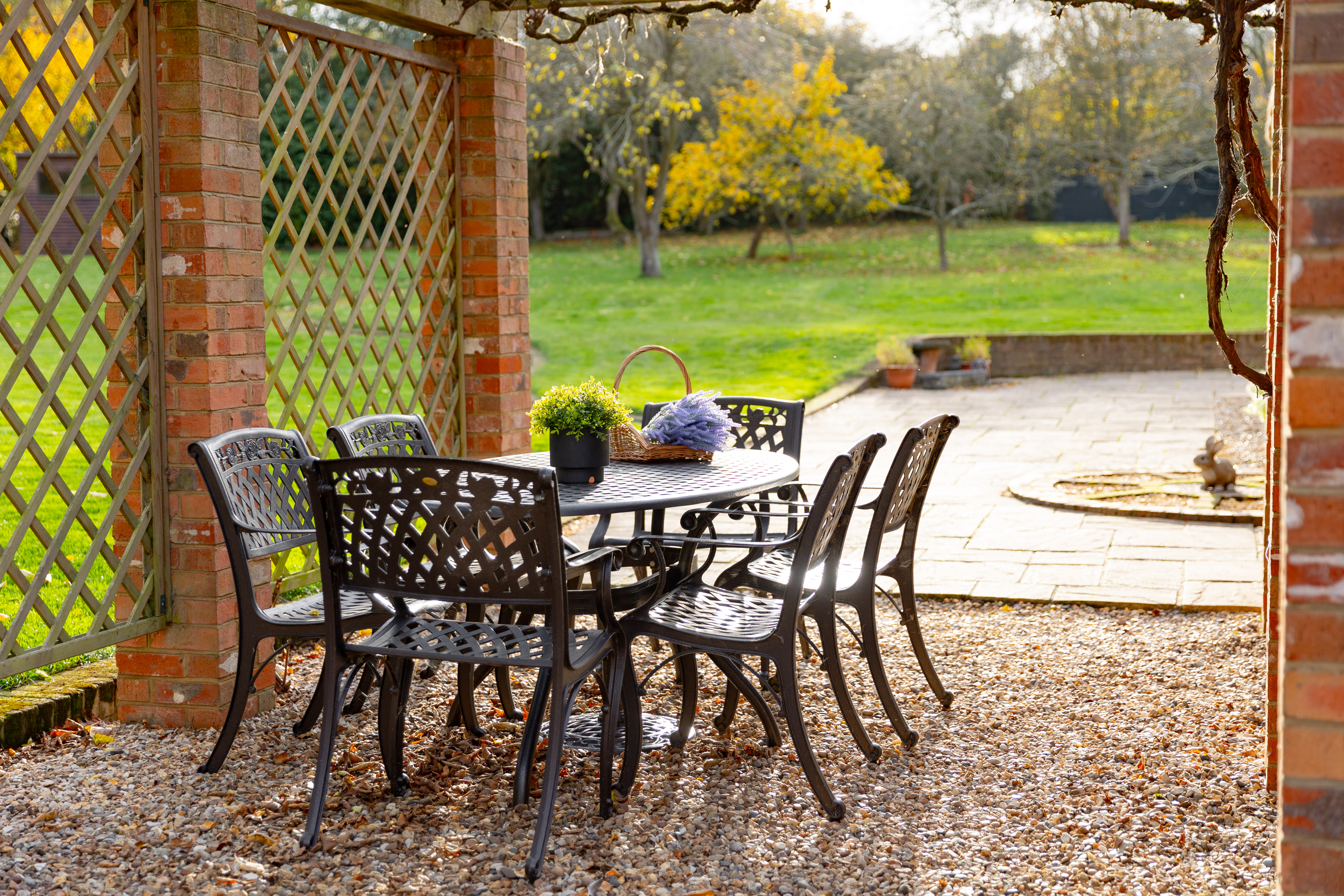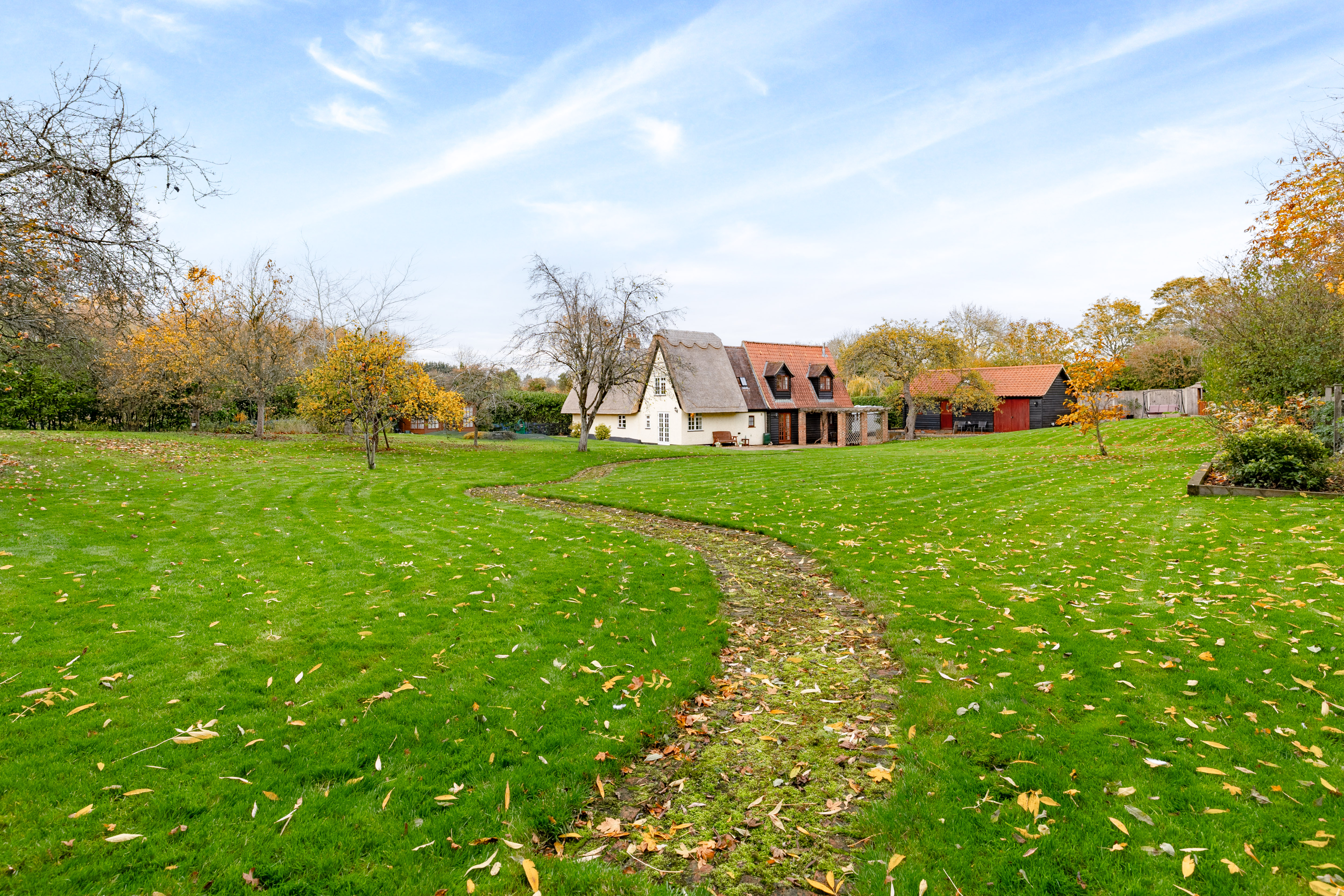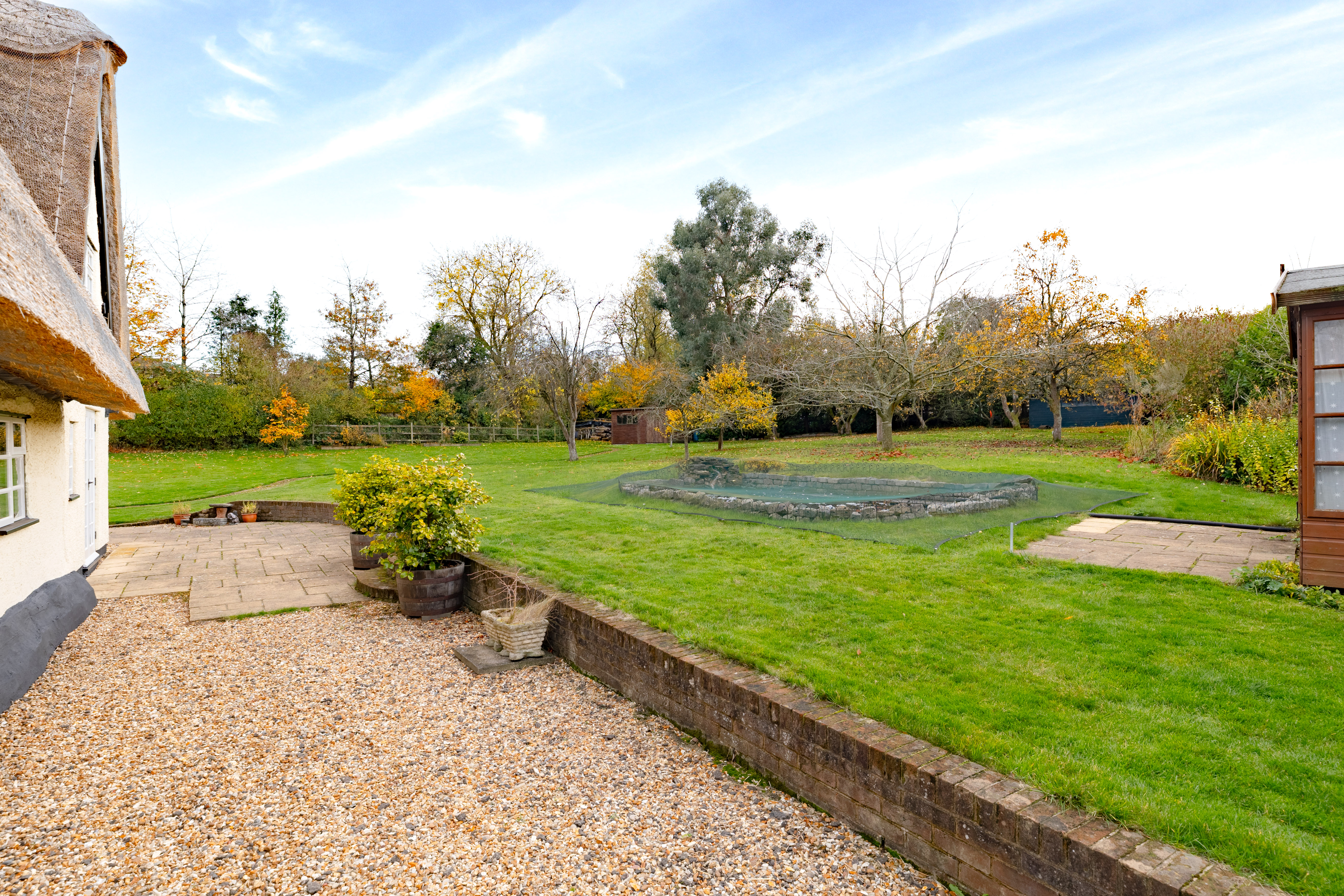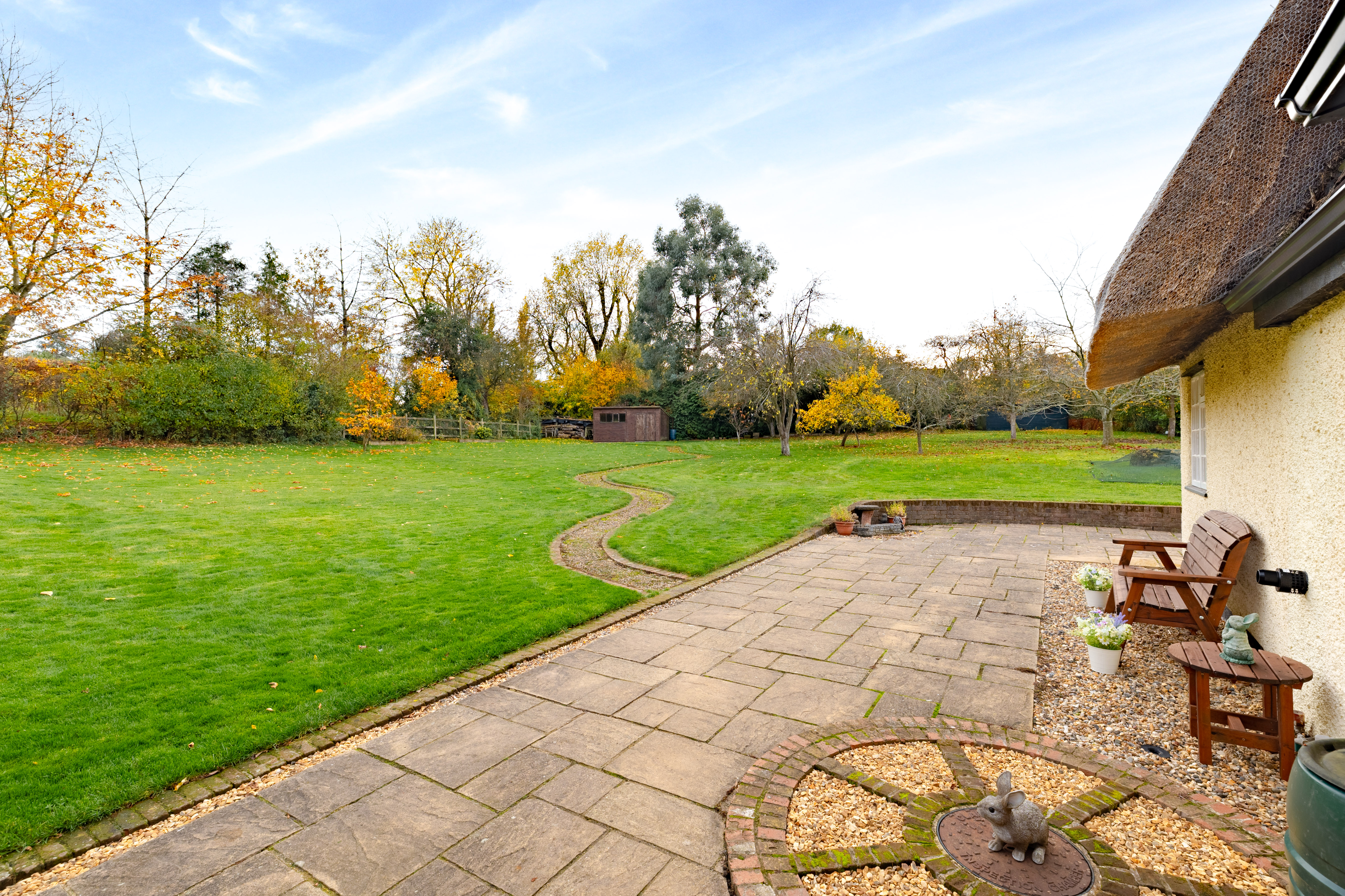 The gardens surround the cottage and outbuildings, creating a private and attractive setting that complements the property’s character. The outdoor space is well suited to both entertaining and everyday enjoyment, with both seating areas and lawn.
