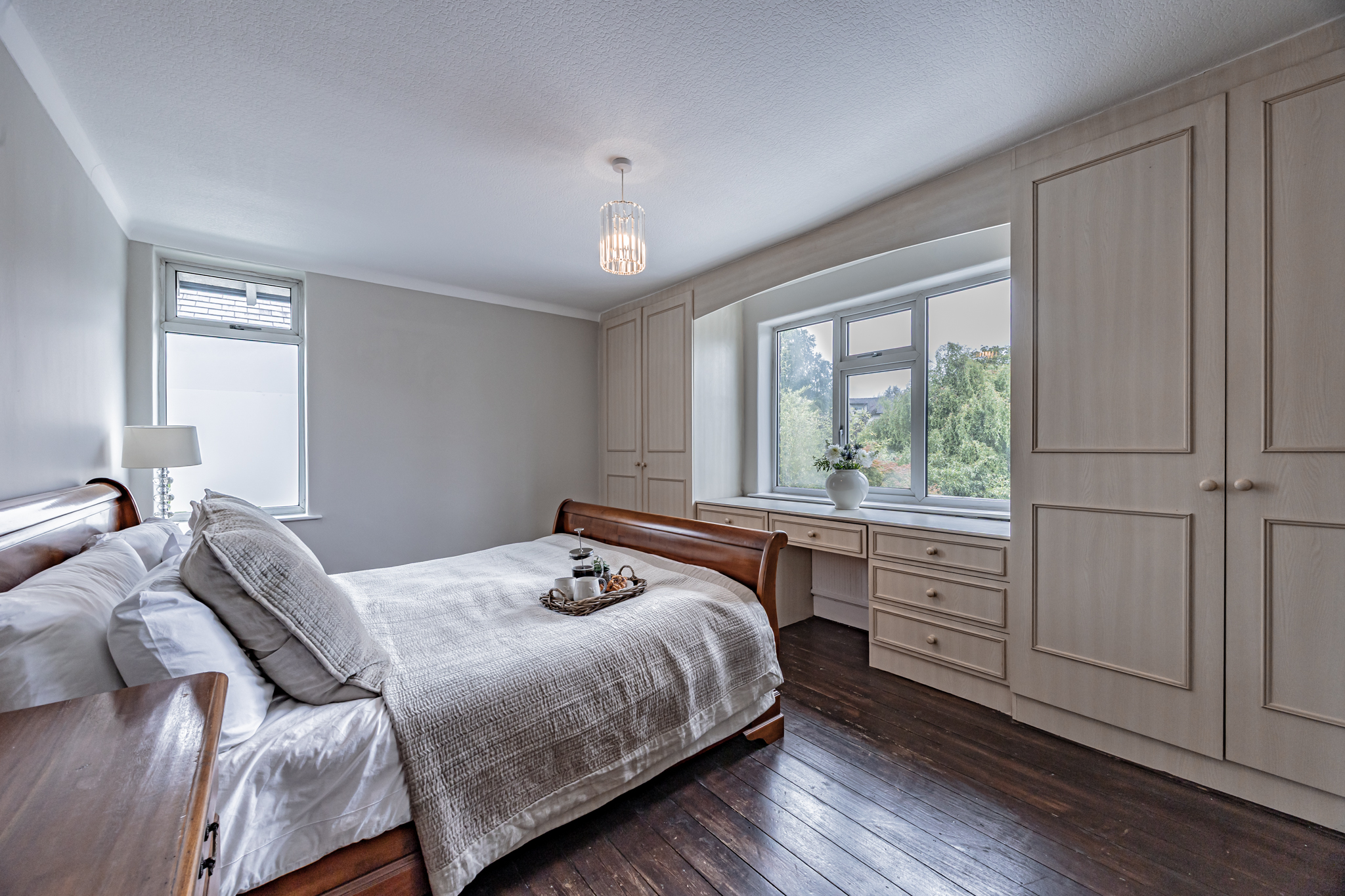 Upstairs, the home continues to impress with four well-proportioned bedrooms, one of which is currently utilised as a home office. The master bedroom features extensive integrated storage and a fitted dressing table, while the guest bedroom also benefits from built-in wardrobes. The family bathroom is beautifully appointed with floor-to-ceiling limestone tiles, his and hers sinks, a contemporary wet room-style shower, and a separate bath – all bathed in natural light.