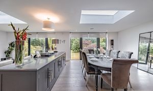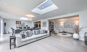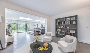 The open-plan area flows effortlessly into a comfortable lounge and dining space, with underfloor heating throughout the living zones and hallway, creating a warm and welcoming atmosphere. This space also offers flexibility to be styled as a reading nook or library, and large sliding doors open directly onto the garden, blurring the line between indoors and out. A separate sitting room or study provides a quiet retreat - perfect for working from home or as a relaxed second lounge.