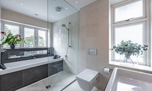 - Elegant Family Bathroom - Featuring his and hers sinks, a wet-room style shower, and a separate bath with floor-to-ceiling limestone tiling.
