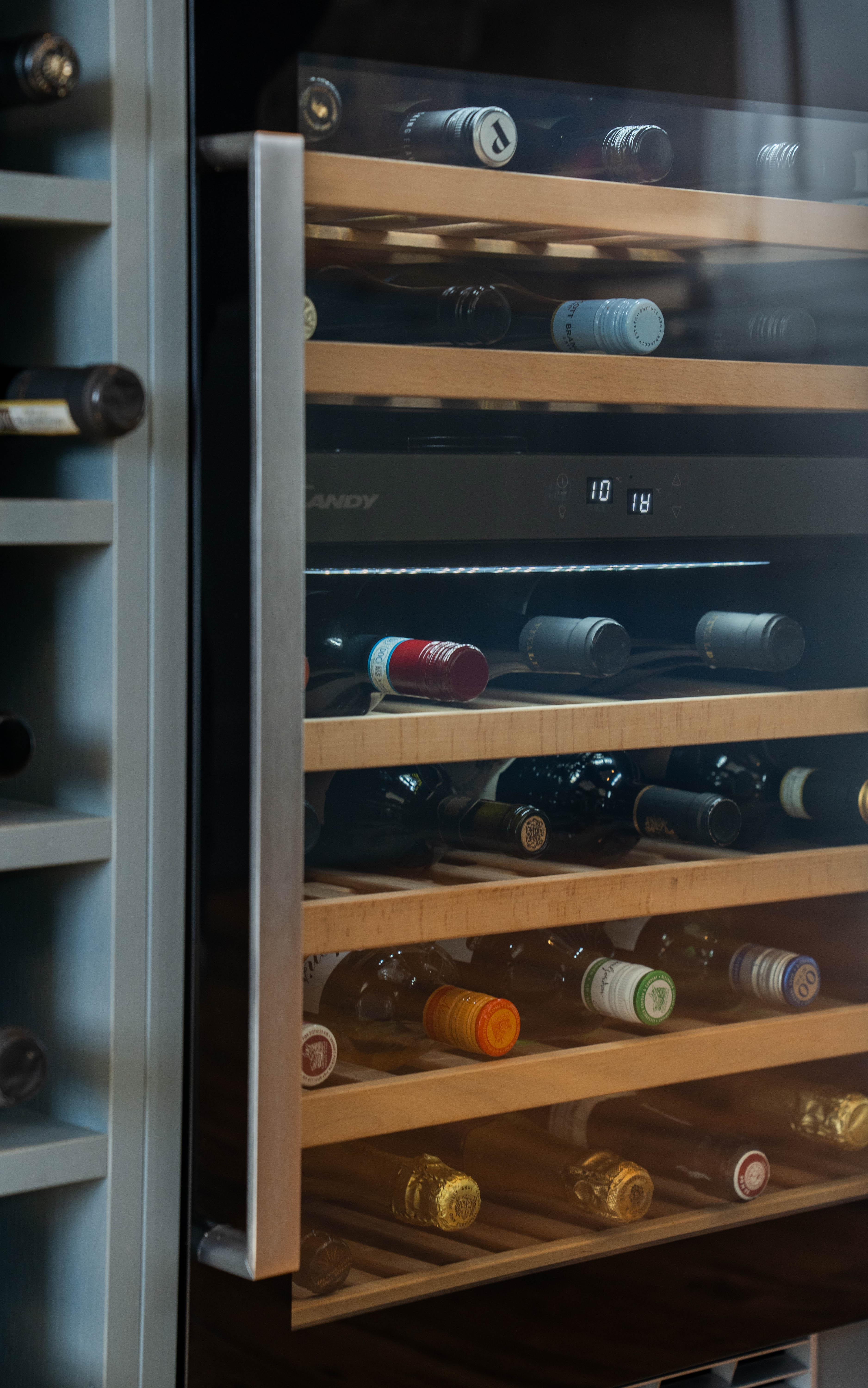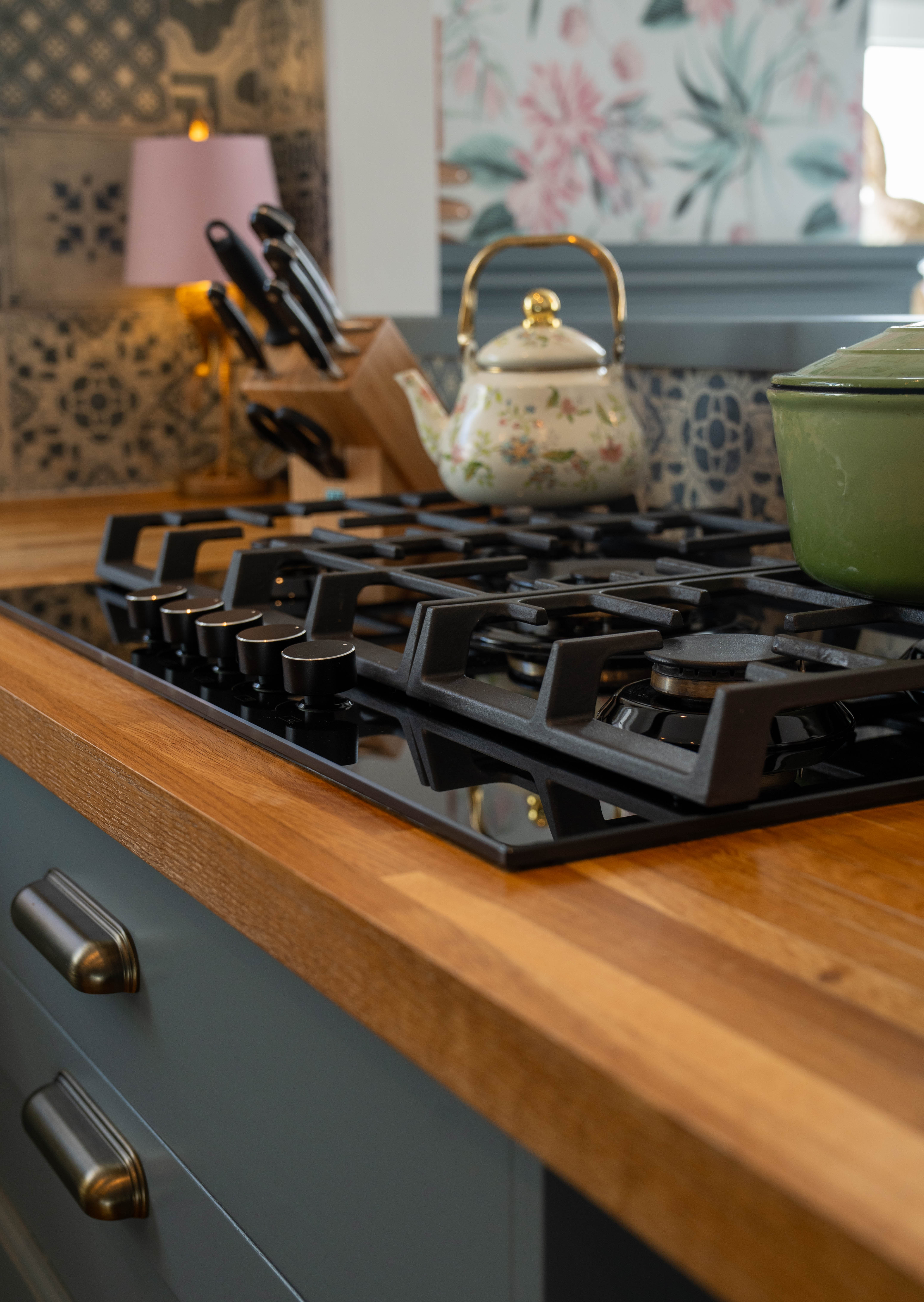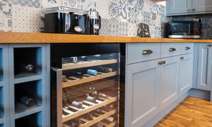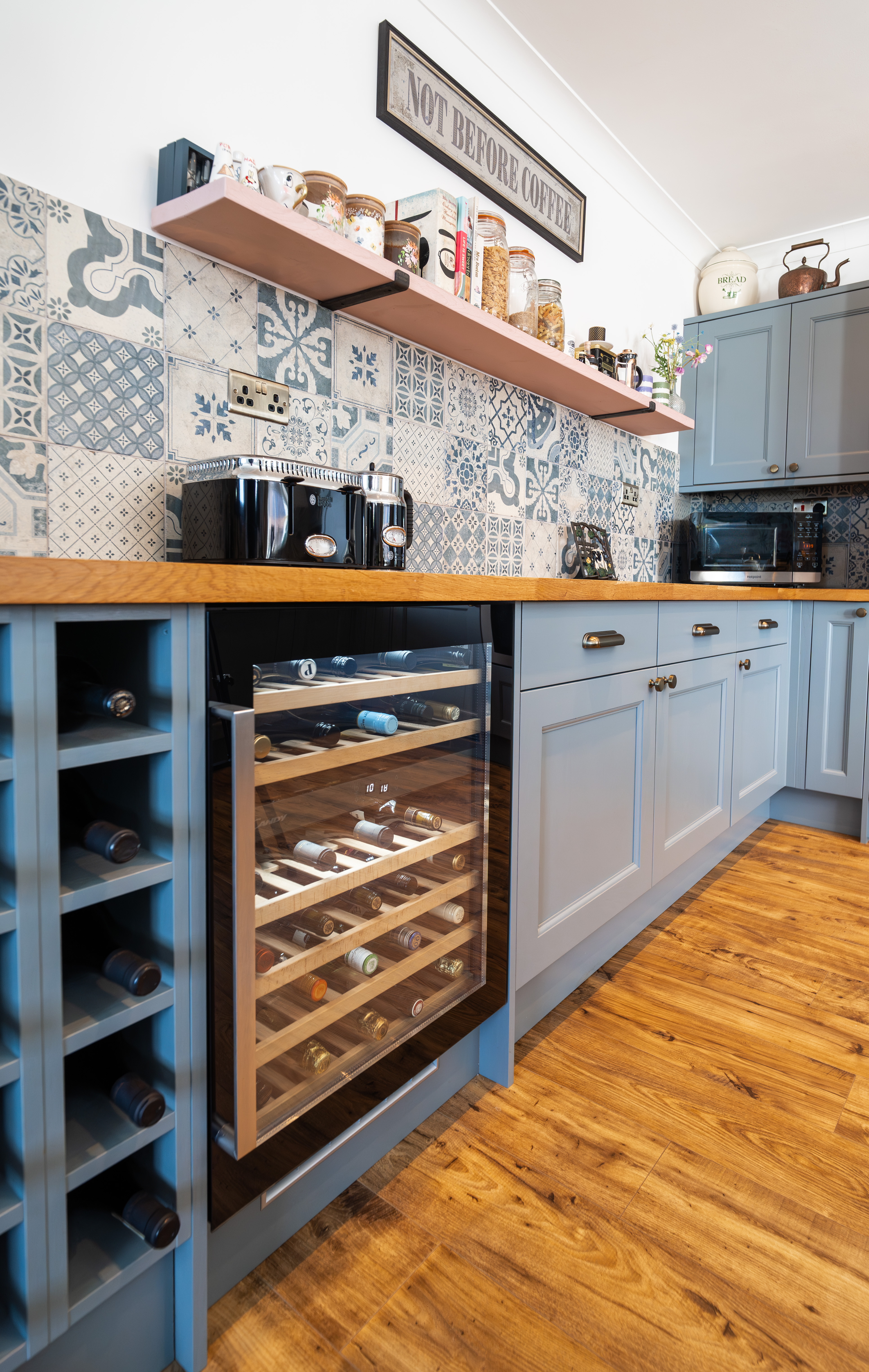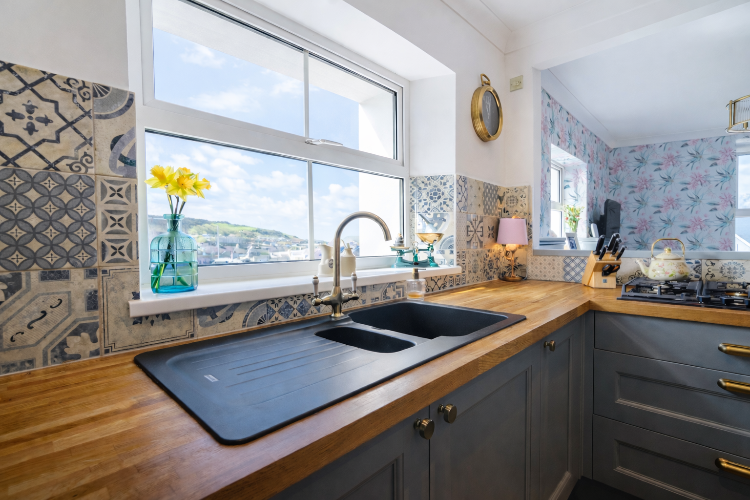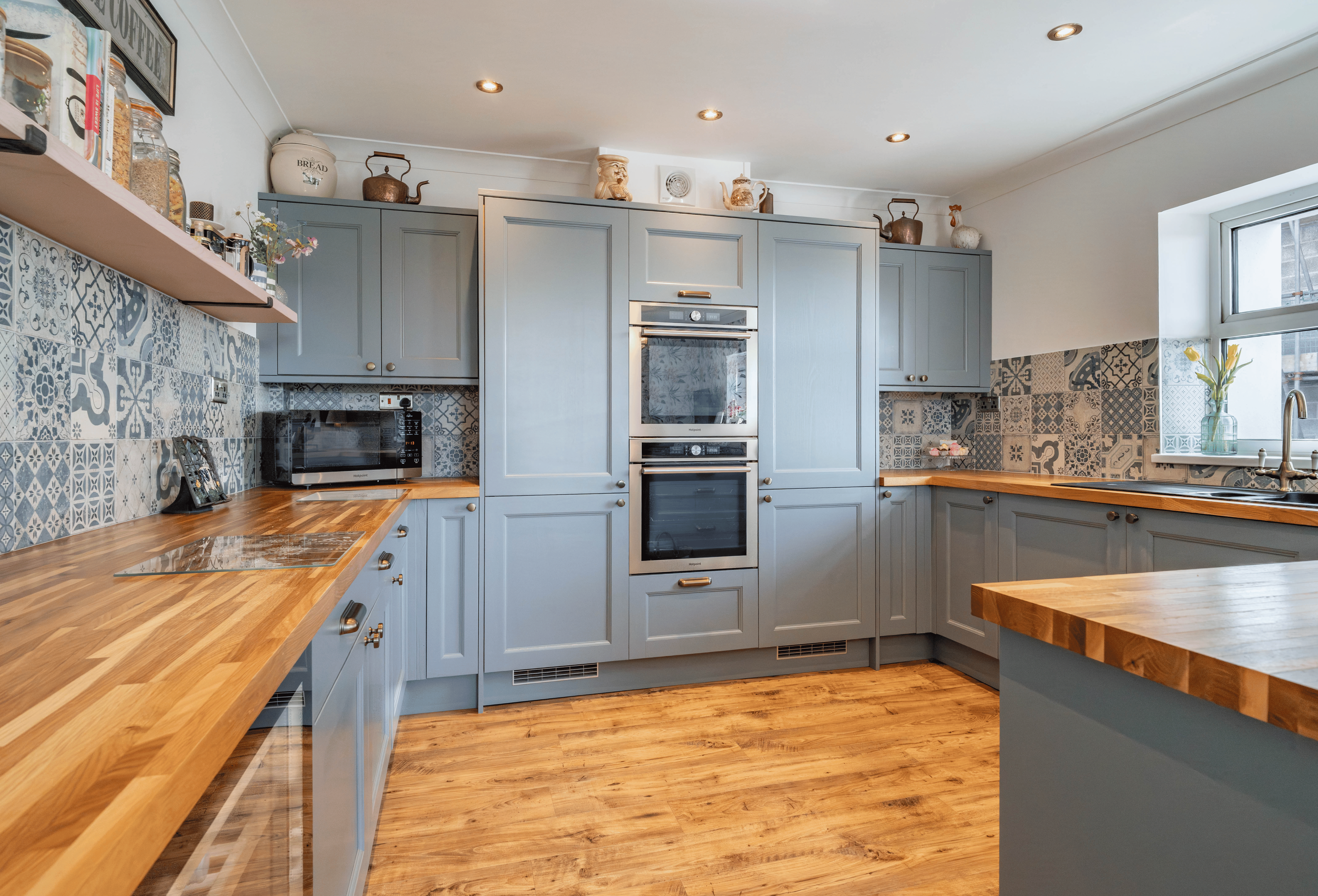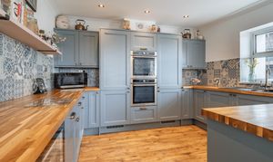 The kitchen is a beautifully designed space, combining classic style with modern functionality. Fitted with elegant cabinetry and solid oak worktops, it is complemented by patterned tiled splashbacks and antique brass sockets and switches. A range of integrated appliances includes a glass Rangemaster five-burner LPG gas hob with extractor, two built-in pyrolytic electric ovens, a Candy wine cooler, and full-height integrated fridge and frost-free freezer. A Franke sink is positioned beneath the window, while under-cabinet lighting enhances both practicality and ambience. Finished with durable LVT flooring and offering plumbing for a dishwasher, this stylish kitchen provides an ideal setting for everyday living and entertaining.