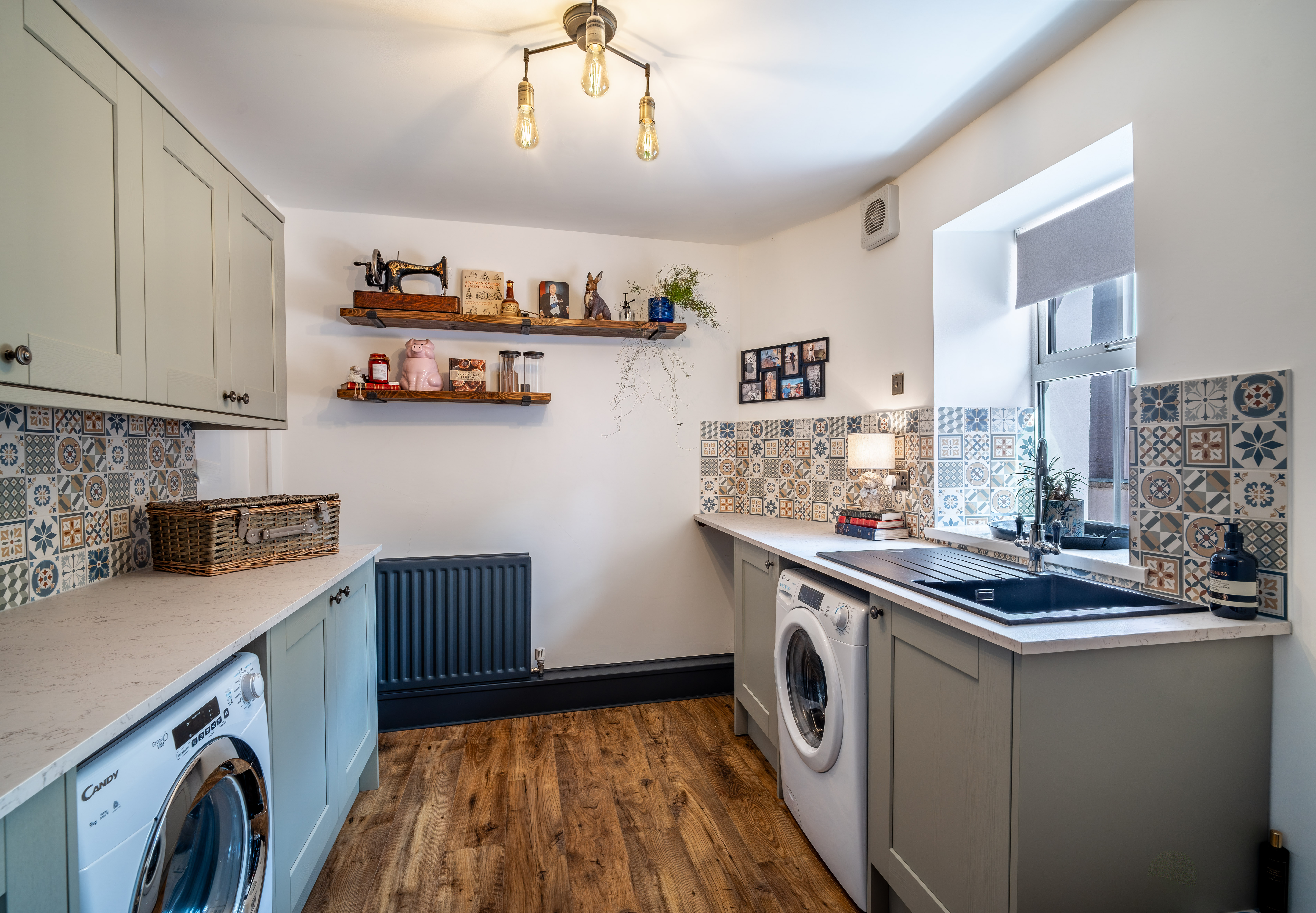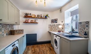 The utility room is a well-designed and practical space, offering excellent functionality while maintaining the home’s cohesive and stylish finish. Fitted with contemporary cabinetry and ample worktop space, it provides an ideal area for laundry and additional household storage. A sleek black granite composite sink adds a modern touch, complemented by attractive patterned tiled splashbacks that introduce colour and character. Space and plumbing for appliances are neatly integrated, ensuring the room remains both efficient and uncluttered. Finished with durable LVT flooring, the utility room is perfectly suited to everyday use, combining practicality with thoughtful design to create a highly functional and visually appealing space.